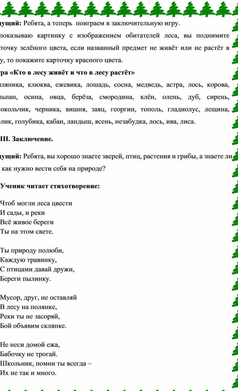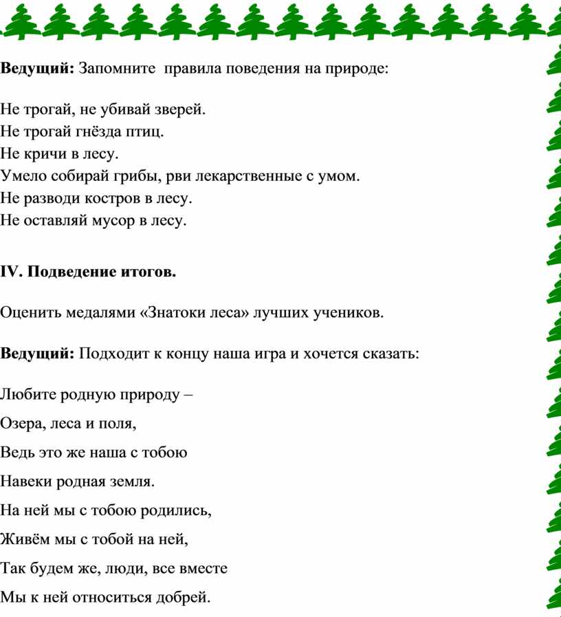 Ведущий: Ребята, вы хорошо знаете зверей, птиц, растения и грибы, а знаете ли вы, как нужно вести себя на природе?