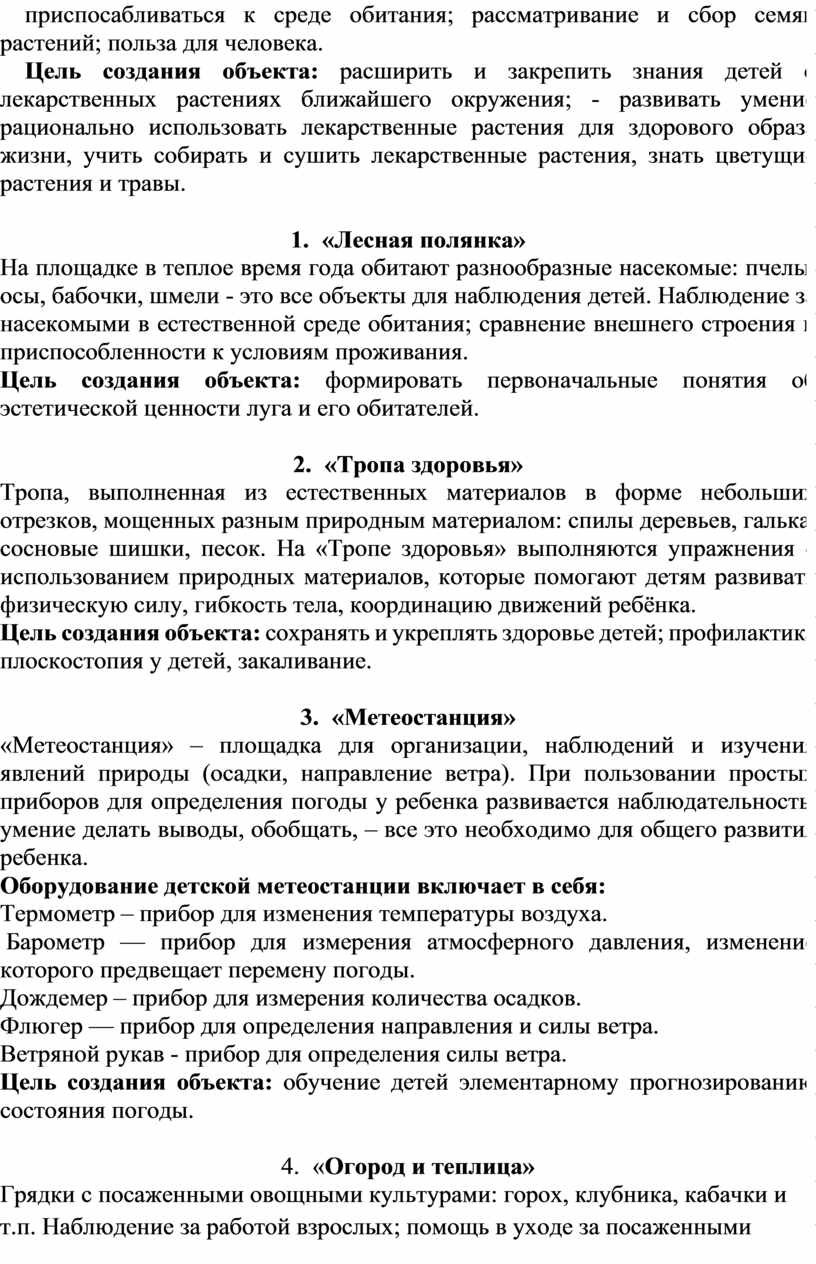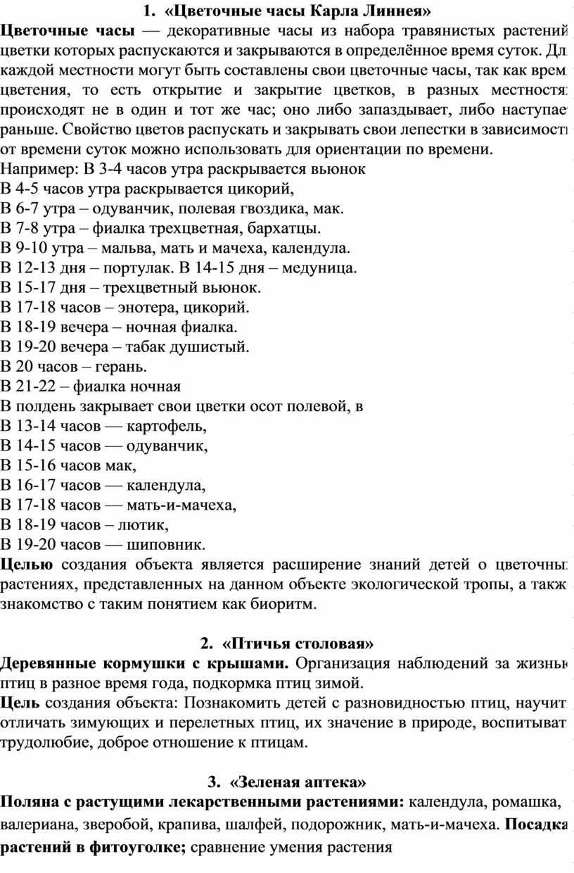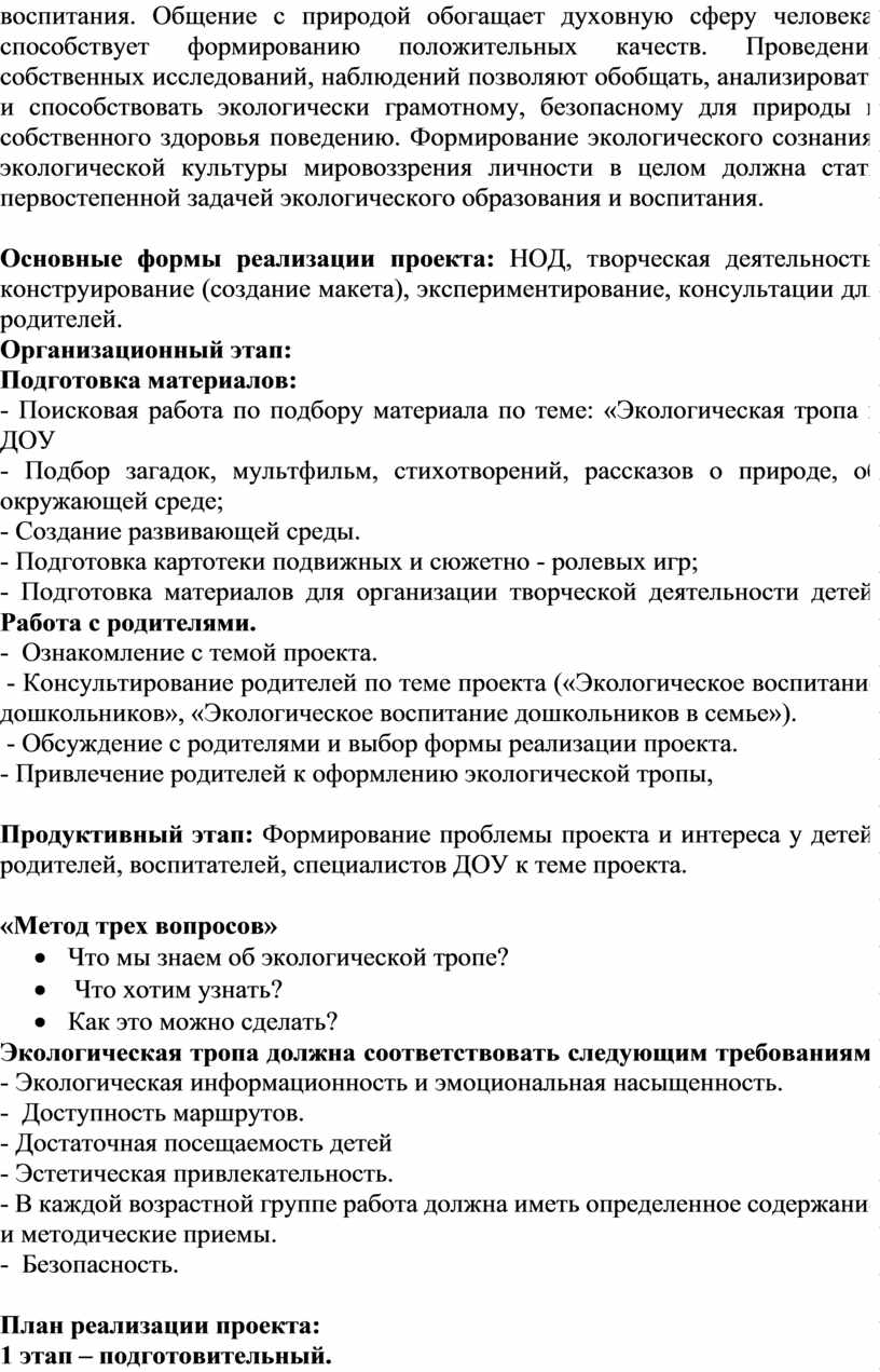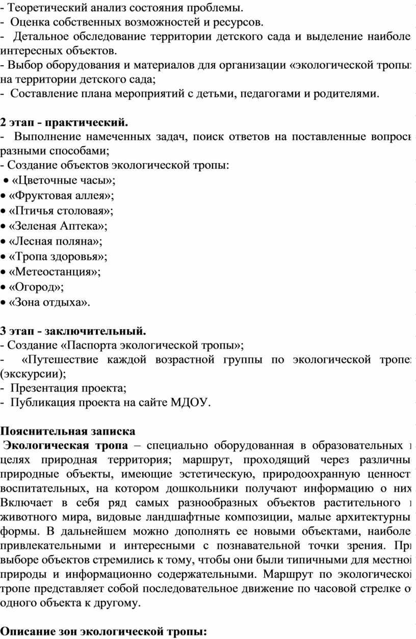Экологическая тропа – специально оборудованная в образовательных и целях природная территория; маршрут, проходящий через различные природные объекты, имеющие эстетическую, природоохранную ценность воспитательных, на котором дошкольники получают информацию о них. Включает в себя ряд самых разнообразных объектов растительного и животного мира, видовые ландшафтные композиции, малые архитектурные формы. В дальнейшем можно дополнять ее новыми объектами, наиболее привлекательными и интересными с познавательной точки зрения. При выборе объектов стремились к тому, чтобы они были типичными для местной природы и информационно содержательными. Маршрут по экологической тропе представляет собой последовательное движение по часовой стрелке от одного объекта к другому.
