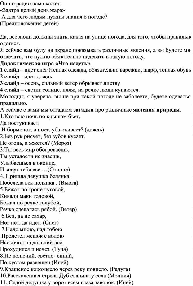 Материал и оборудование: экран, компьютер, презентации: «Что надеть», « О профессиях», «Метеорологическая станция».