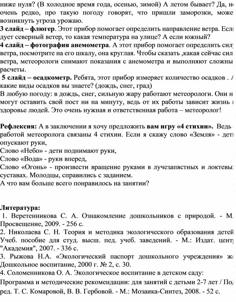 1. Веретенникова С. А. Ознакомление дошкольников с природой. - М.: Просвещение, 2009. - 256 с.
