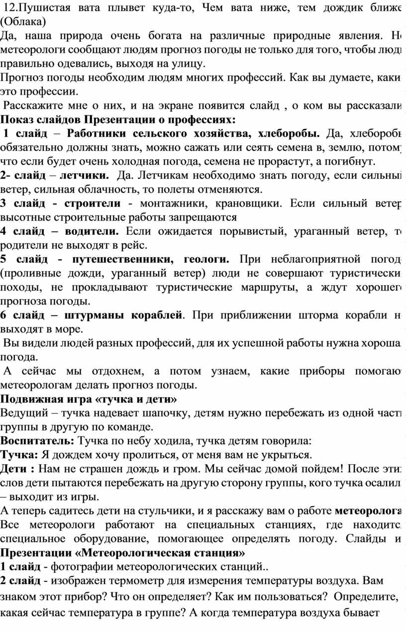 Воспитатель: Ребята, сегодня мы с вами будем говорить, чем занимаются люди по профессии метеоролог? Как, по вашему, что они делают. (Предположения детей) Да, они определяют погоду на сегодня, прогнозируют погоду на неделю, месяц. А что такое погода? А что такое прогноз погоды? (Предположения детей) А где можно услышать прогноз погоды? (по телевизору, по радио, посмотреть в интернете) А как называются люди, занимающие изучением погоды. Да, это люди по профессии метеорологи. Метеорологи стараются узнать все особенности погоды: температуру воздуха и воды, силу и направления ветра, наличие осадков.