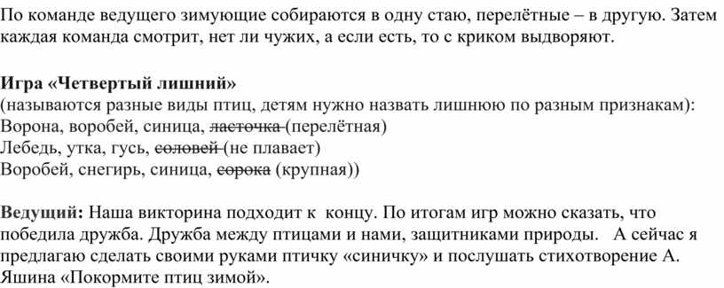 Ведущий: Наша викторина подходит к концу. По итогам игр можно сказать, что победила дружба. Дружба между птицами и нами, защитниками природы. А сейчас я предлагаю сделать своими руками птичку «синичку» и послушать стихотворение А. Яшина «Покормите птиц зимой».