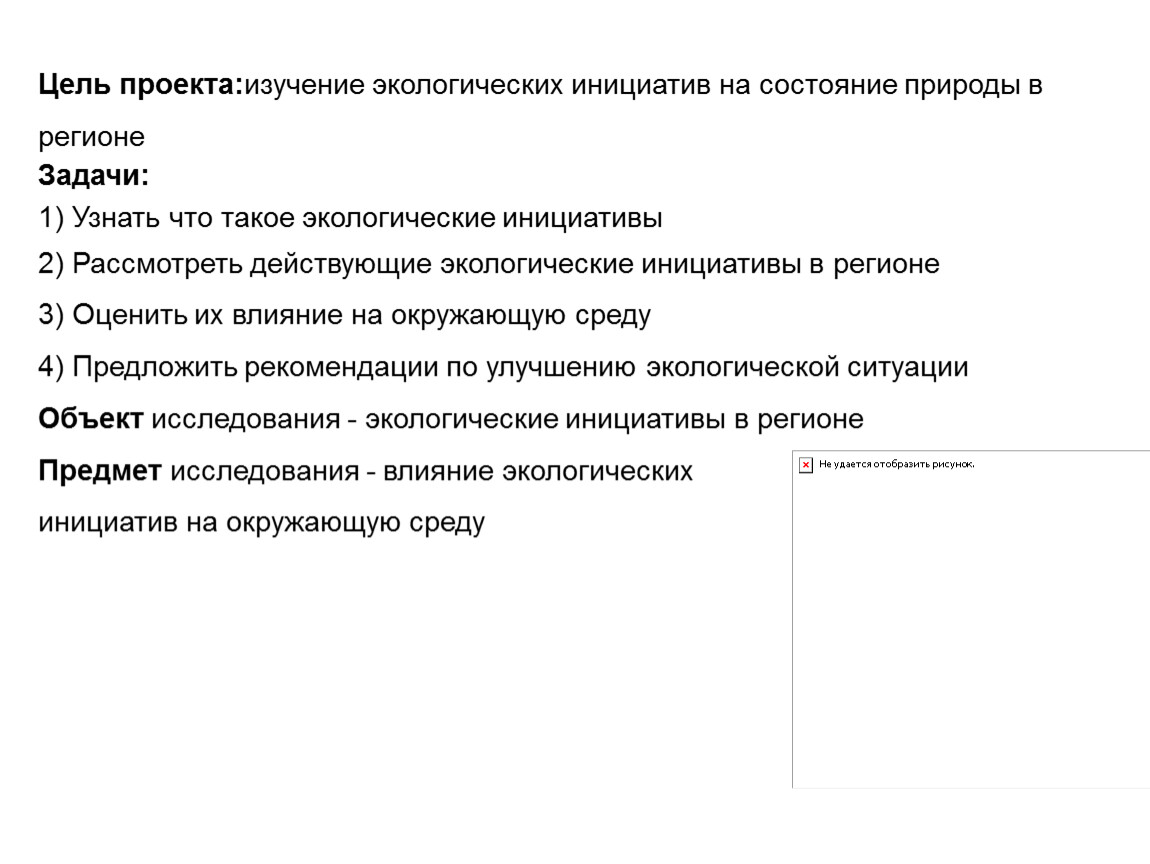Цель проекта:изучение экологических инициатив на состояние природы в регионе