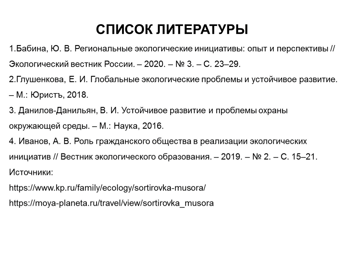 1.Бабина, Ю. В. Региональные экологические инициативы: опыт и перспективы // Экологический вестник России. – 2020. – № 3. – С. 23–29.