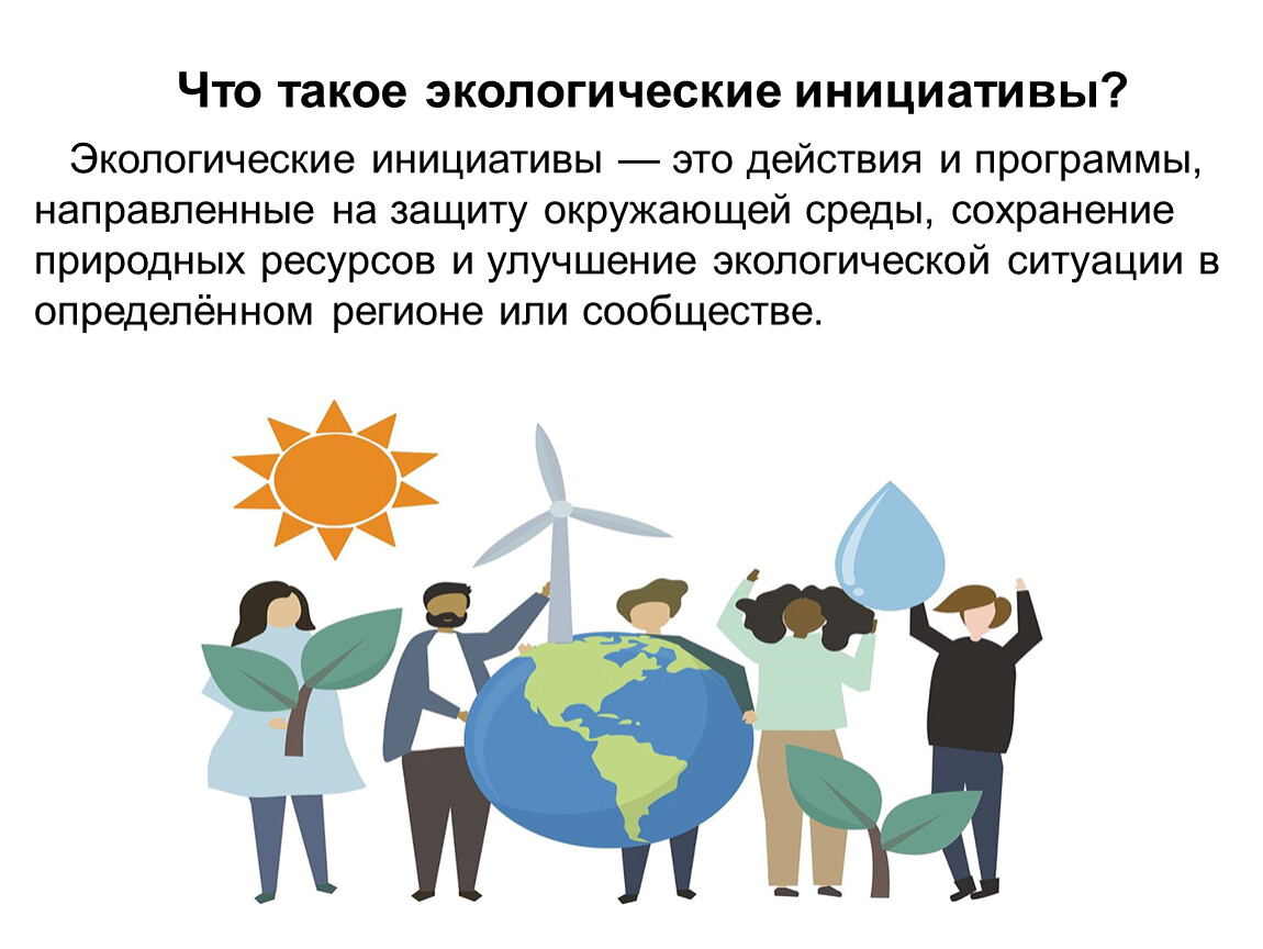 Экологические инициативы — это действия и программы, направленные на защиту окружающей среды, сохранение природных ресурсов и улучшение экологической ситуации в определённом регионе или сообществе.