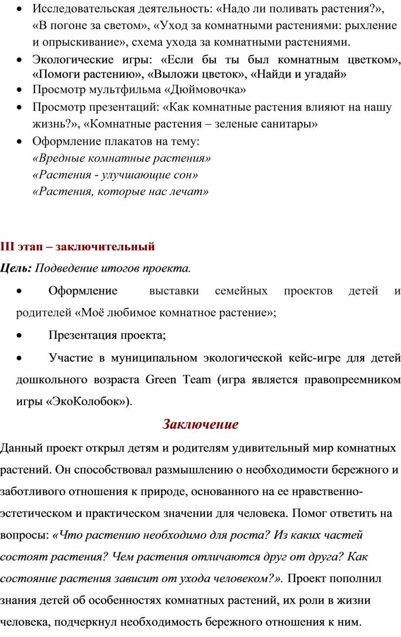 Таким образом, благодаря проделанной работе, у детей развился устойчивый интерес к комнатным растениям, закрепились и улучшились их знания по данной теме, отметилось активное включение родителей в педагогический процесс, позитивные детско-родительские отношения.