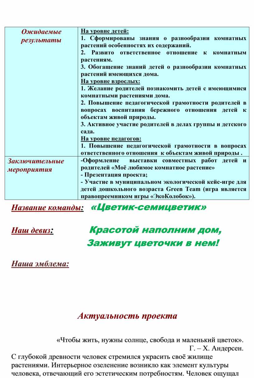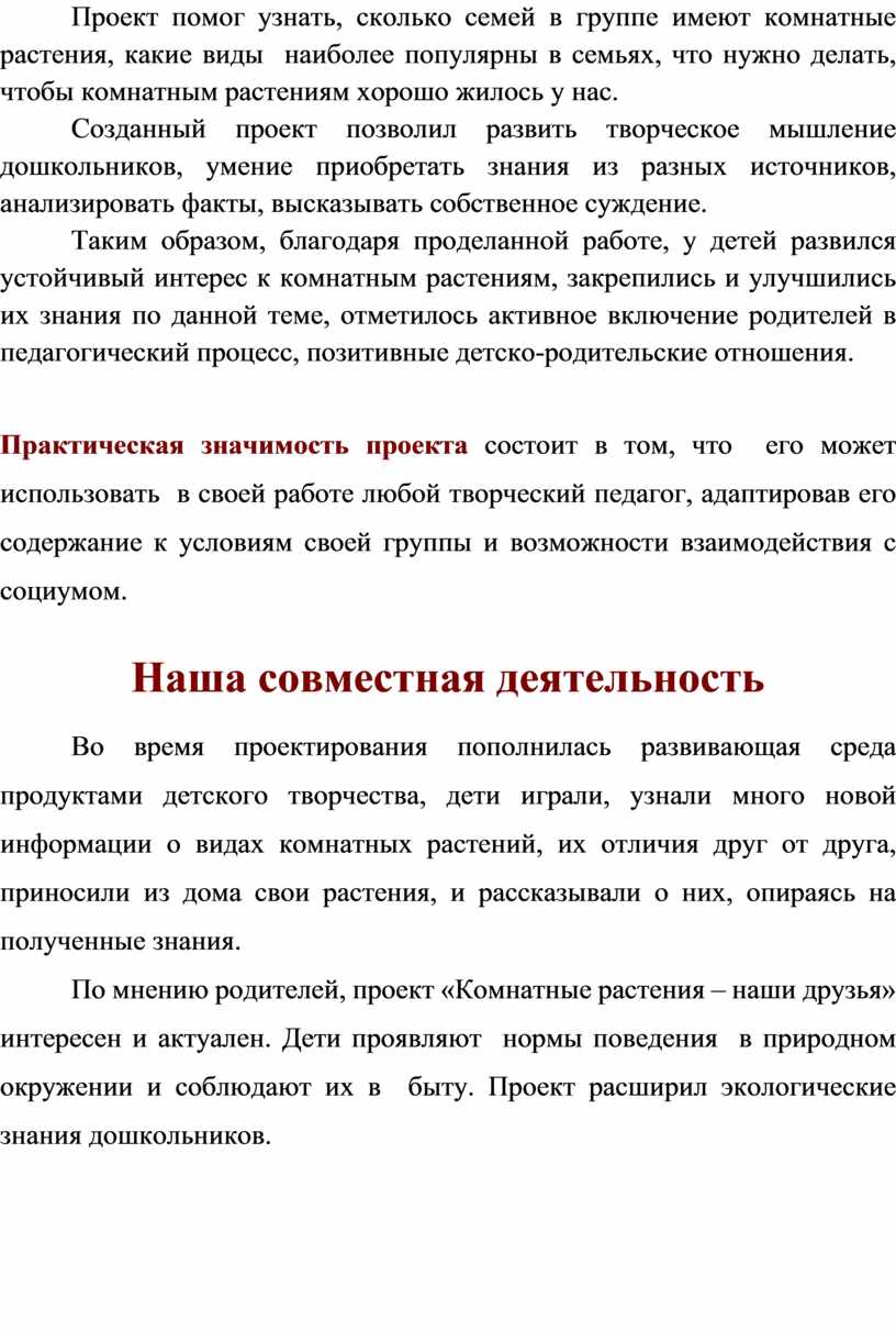 Данный проект открыл детям и родителям удивительный мир комнатных растений. Он способствовал размышлению о необходимости бережного и заботливого отношения к природе, основанного на ее нравственно-эстетическом и практическом значении для человека. Помог ответить на вопросы: «Что растению необходимо для роста? Из каких частей состоят растения? Чем растения отличаются друг от друга? Как состояние растения зависит от ухода человеком?». Проект пополнил знания детей об особенностях комнатных растений, их роли в жизни человека, подчеркнул необходимость бережного отношения к ним.