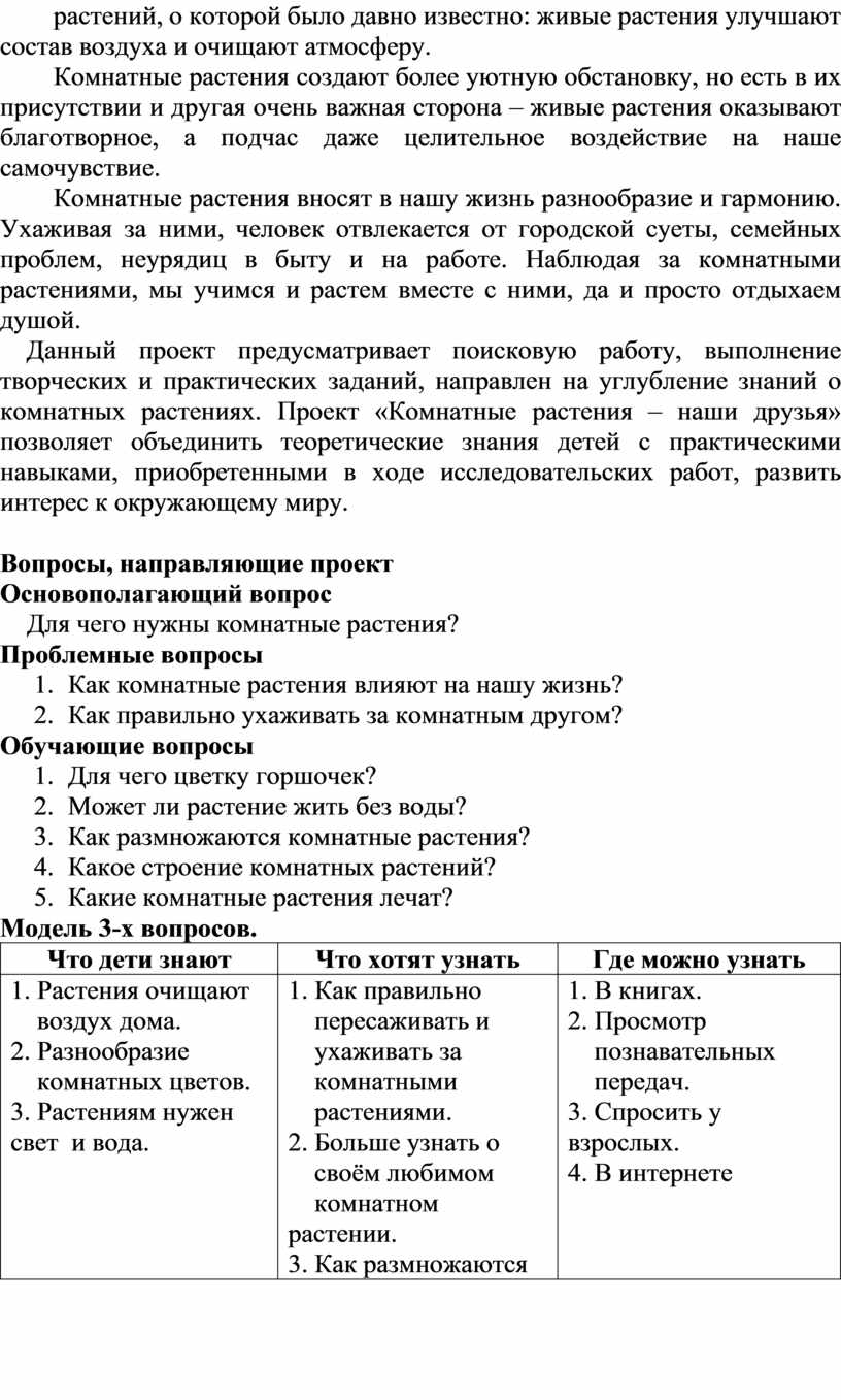 Данный проект предусматривает поисковую работу, выполнение творческих и практических заданий, направлен на углубление знаний о комнатных растениях. Проект «Комнатные растения – наши друзья» позволяет объединить теоретические знания детей с практическими навыками, приобретенными в ходе исследовательских работ, развить интерес к окружающему миру.