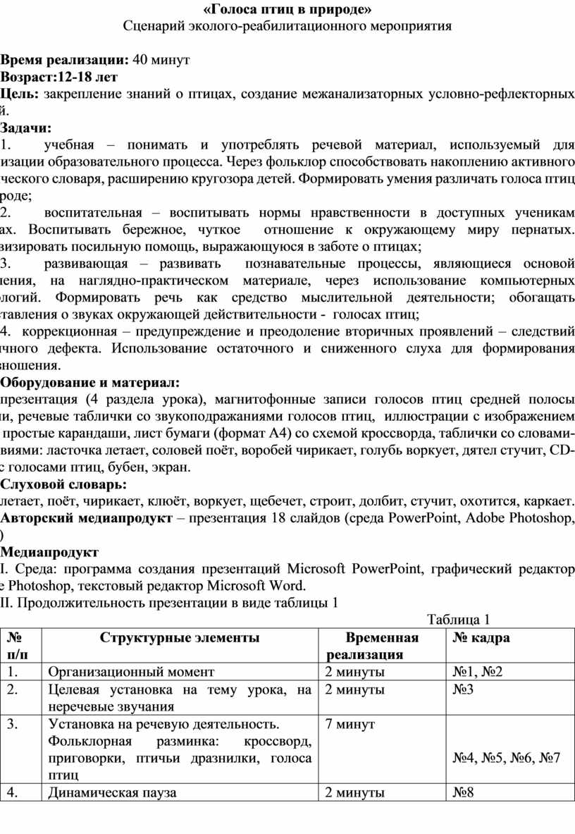 «Голоса птиц в природе» Эколого-реабилитационного мероприятие………….. |