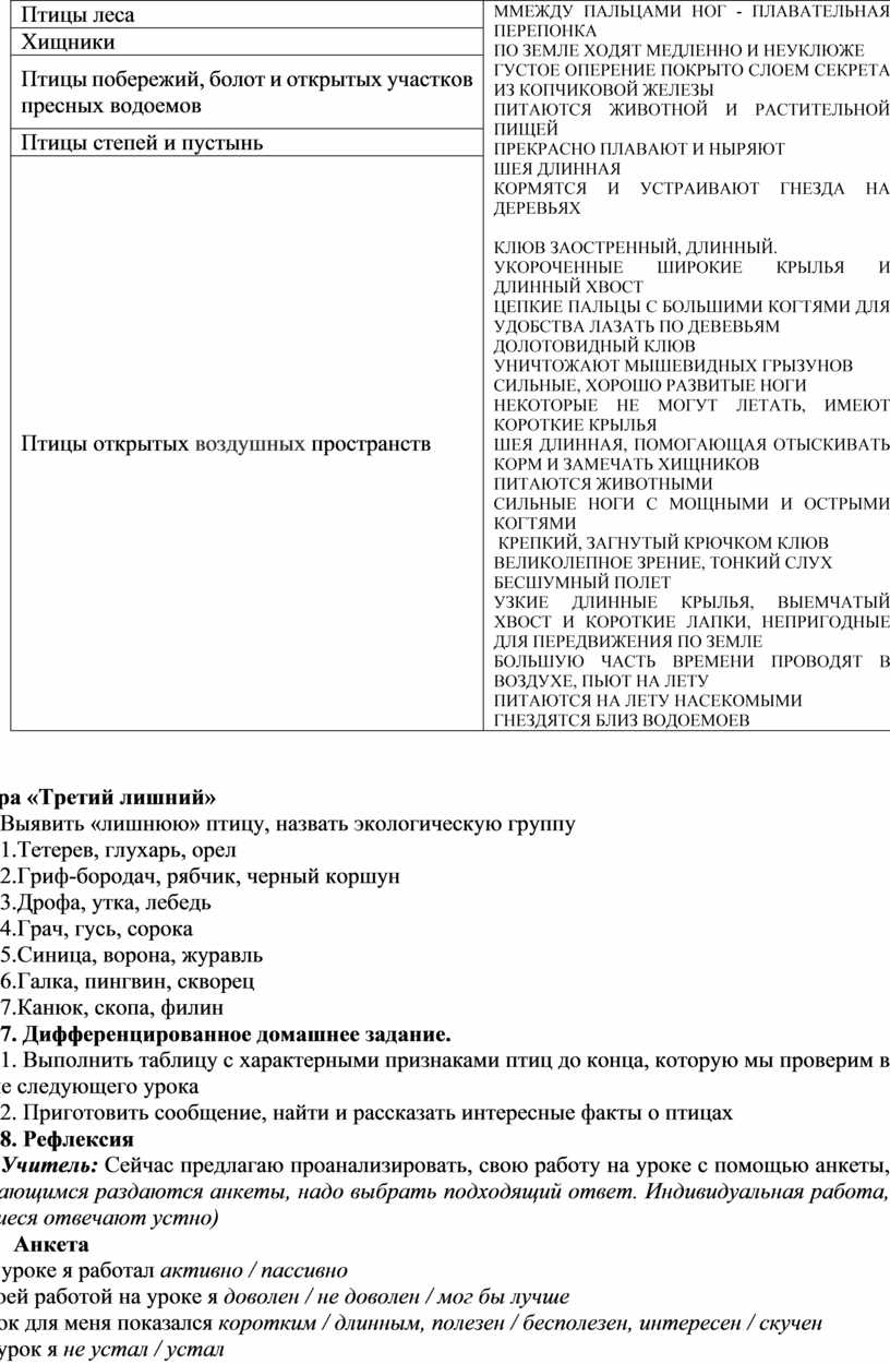 1. Выполнить таблицу с характерными признаками птиц до конца, которую мы проверим в начале следующего урока