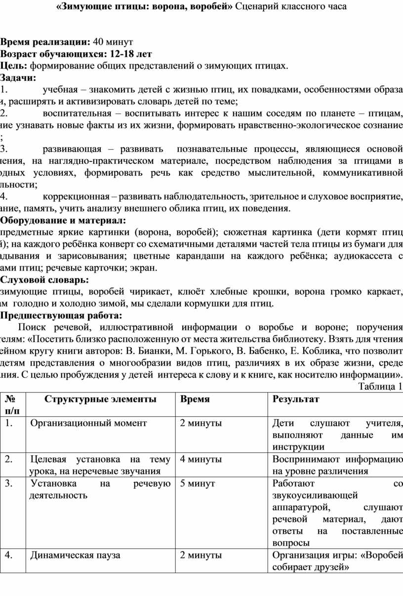 «Зимующие птицы: ворона, воробей» Сценарий классного часа……………….. |