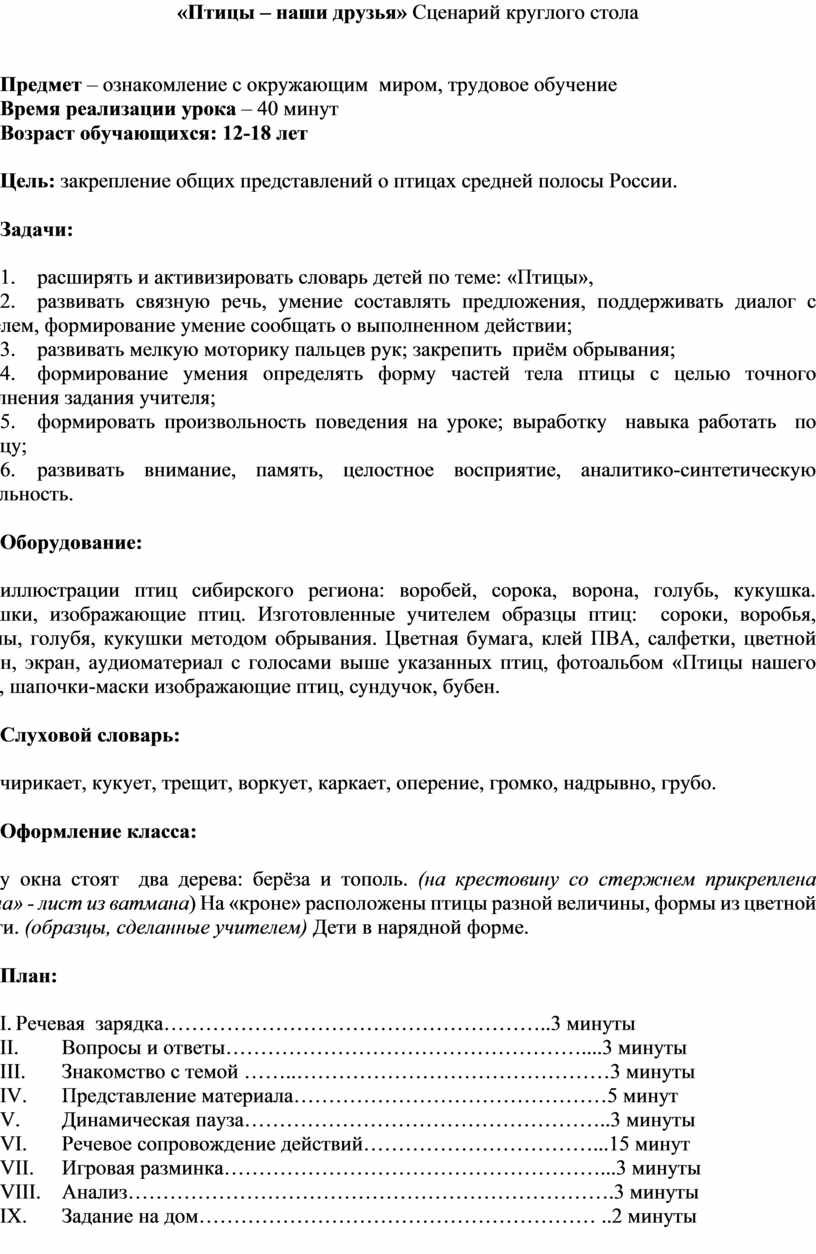 «Птицы – наши друзья» Сценарий круглого стола……………………………….. |