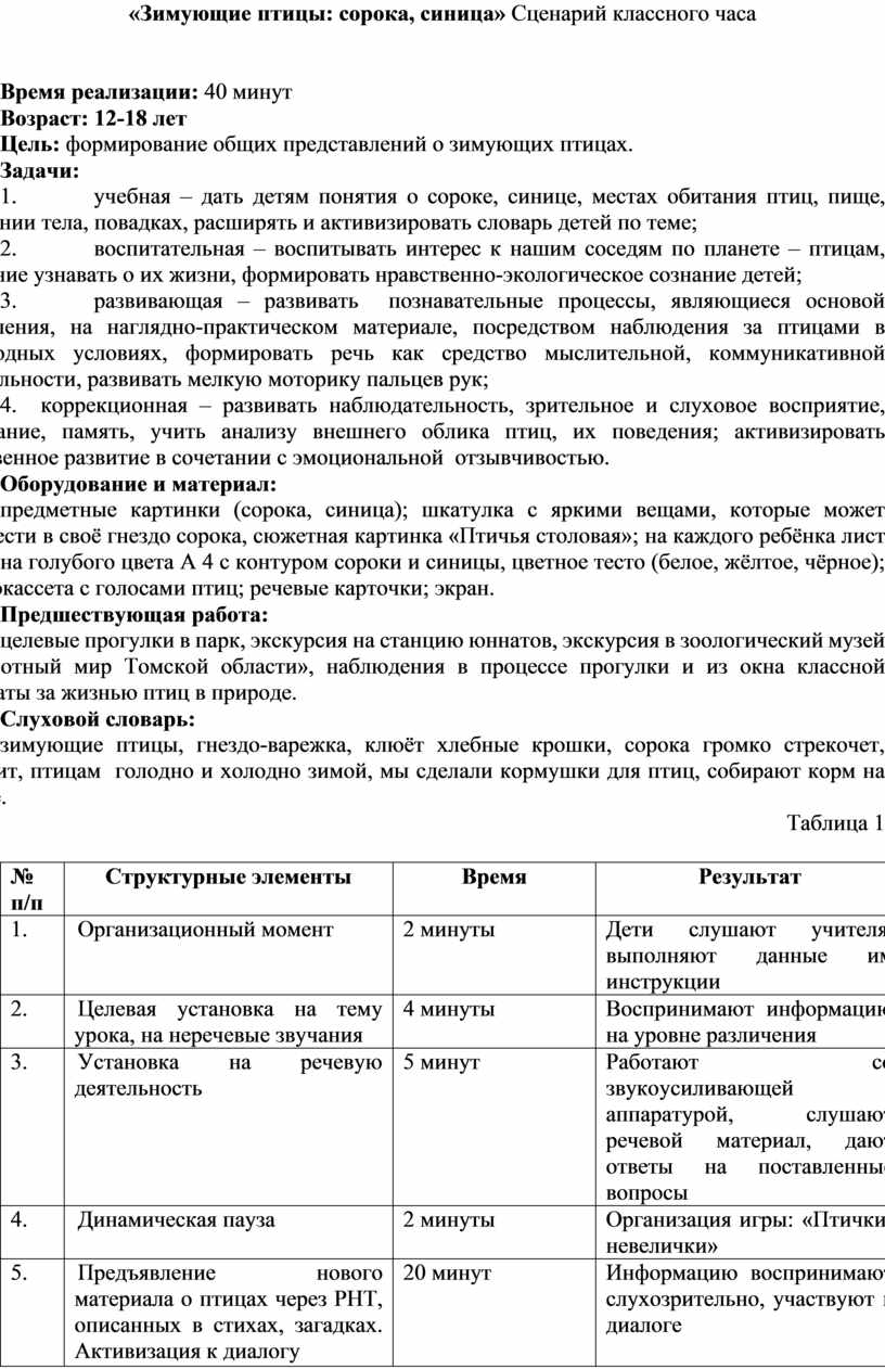 «Зимующие птицы: сорока, синица» Сценарий классного часа………………… |