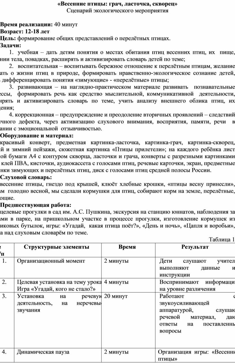 «Птицы вокруг нас» Сценарий классного часа…………………………………… |