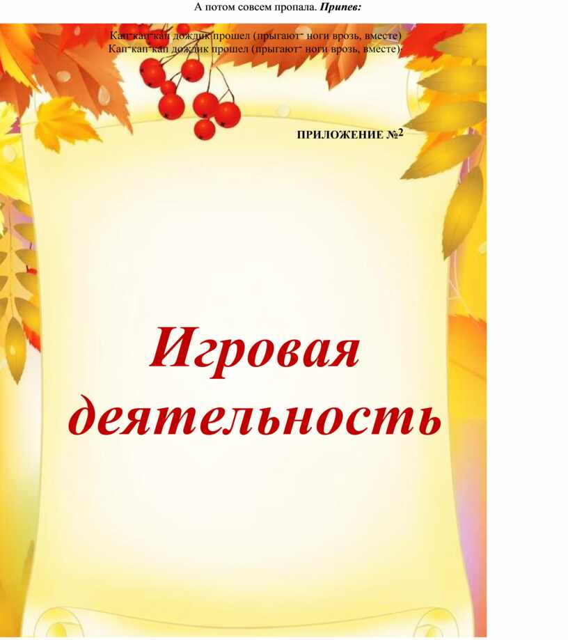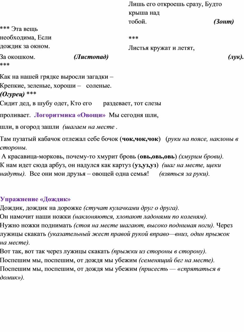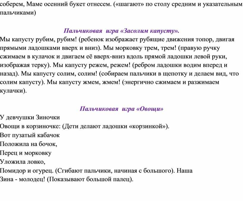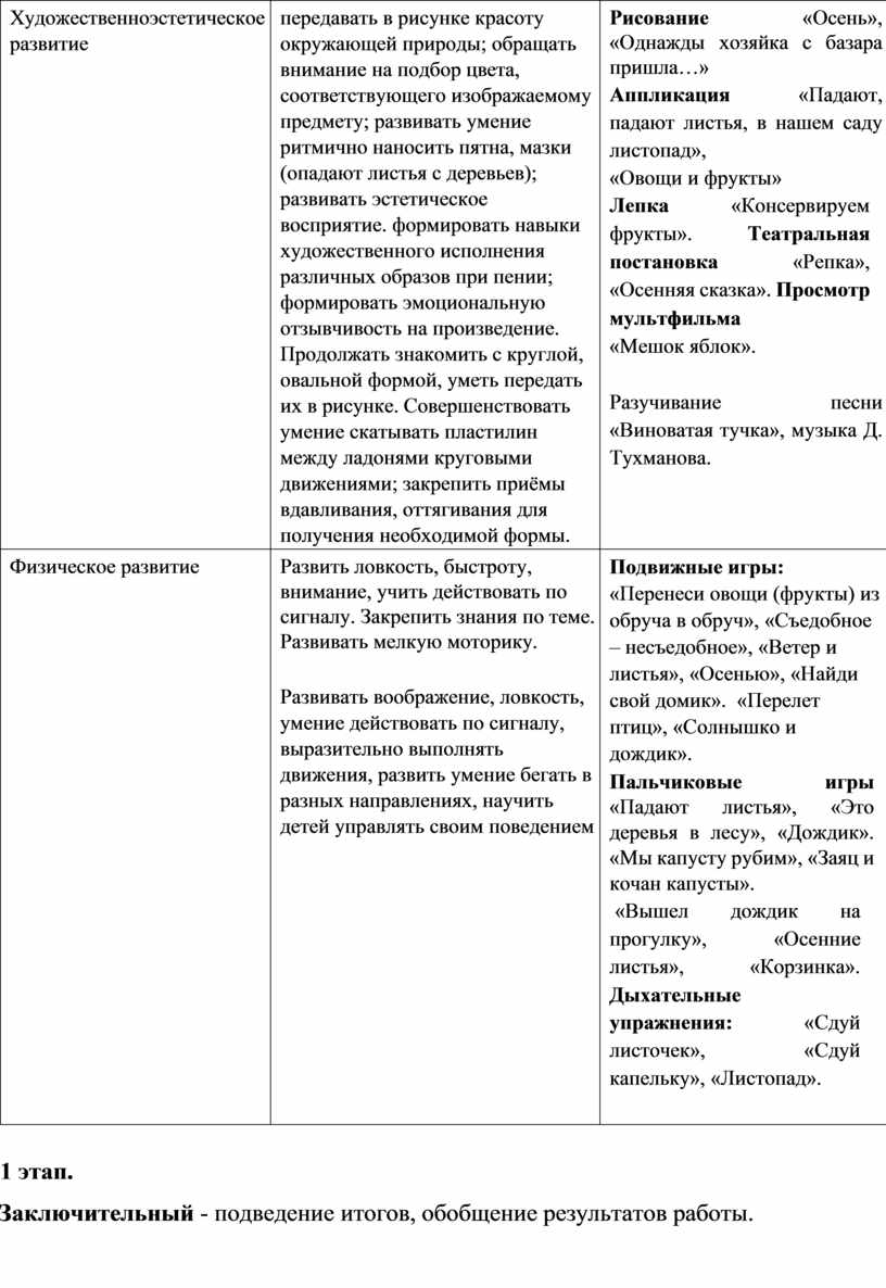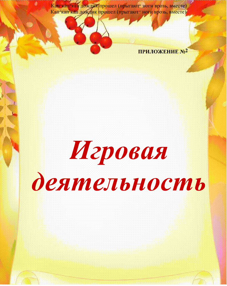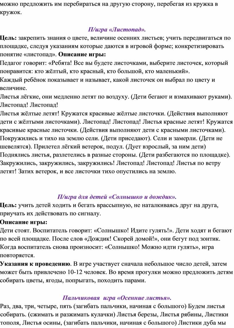 Подвижные игры: «Перенеси овощи (фрукты) из обруча в обруч», «Съедобное – несъедобное», «Ветер и листья», «Осенью», «Найди свой домик». «Перелет птиц», «Солнышко и дождик». Пальчиковые игры «Падают листья», «Это деревья в лесу», «Дождик». «Мы капусту рубим», «Заяц и кочан капусты». «Вышел дождик на прогулку», «Осенние листья», «Корзинка». Дыхательные упражнения: «Сдуй листочек», «Сдуй капельку», «Листопад».