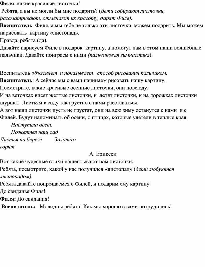 Воспитатель: Филя, а мы тебе не только эти листочки можем подарить. Мы можем нарисовать картину «листопад».