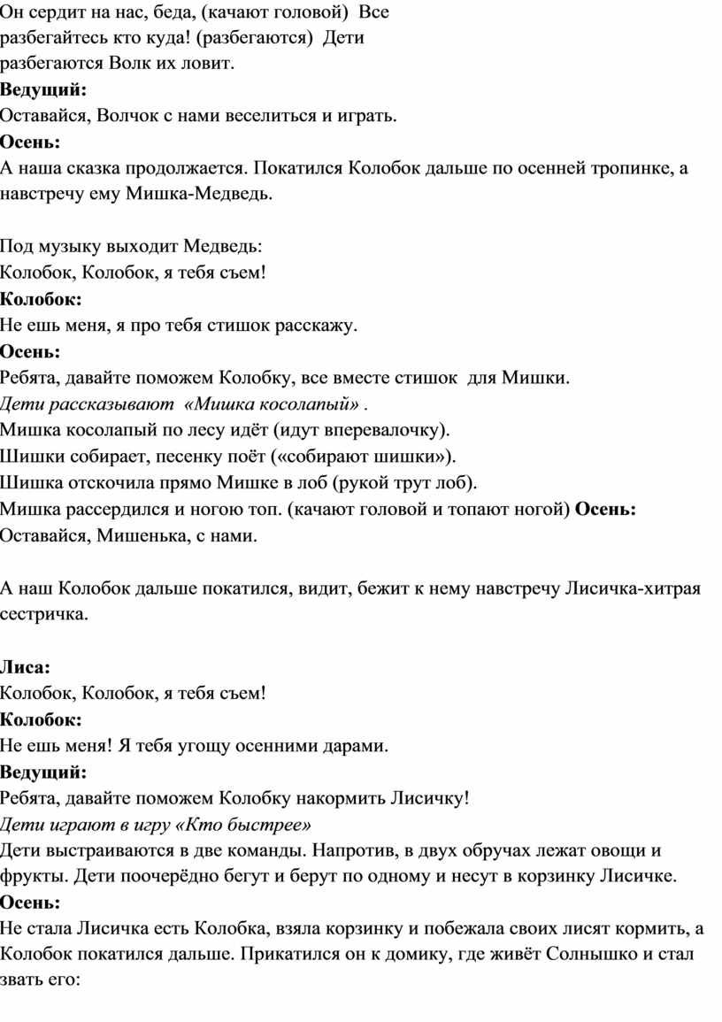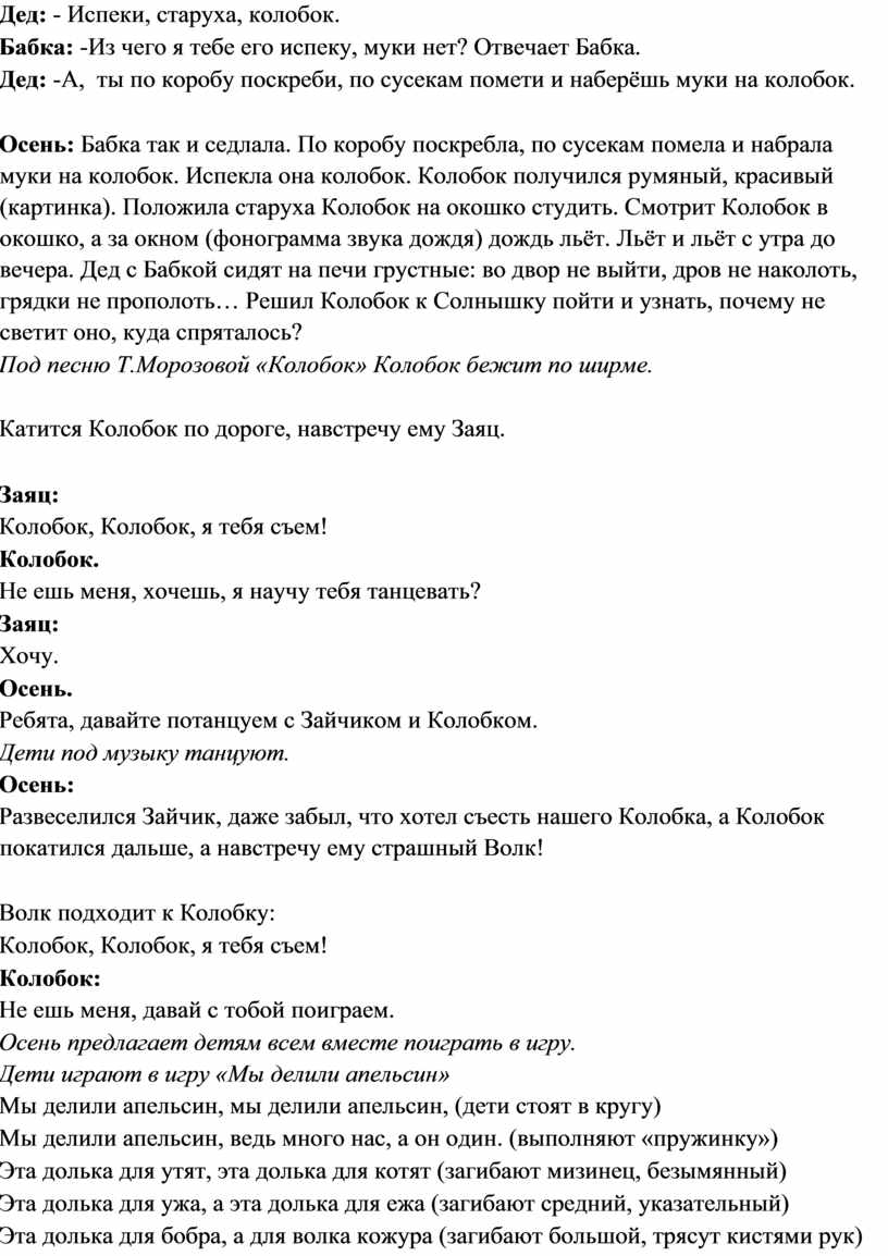 Спасибо, тебе Колобок, спасибо вам, ребята, что помогли мне выйти из домика. Осень: Вернулся Колобок к Бабке с Дедом, видит Бабка огород пропалывает, Дед дрова колет. Увидели они Колобка, обрадовались. Тут и сказке конец, а кто слушал – молодец!