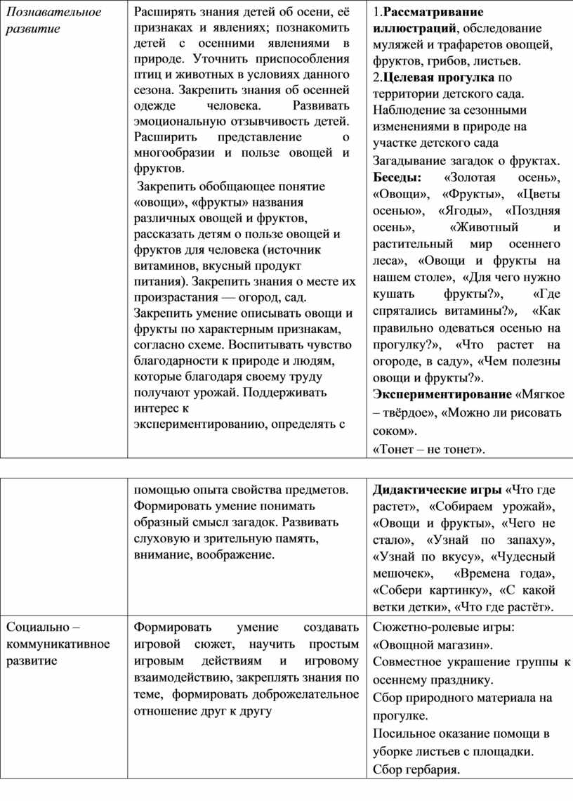 Расширять знания детей об осени, её признаках и явлениях; познакомить детей с осенними явлениями в природе. Уточнить приспособления птиц и животных в условиях данного сезона. Закрепить знания об осенней одежде человека. Развивать эмоциональную отзывчивость детей. Расширить представление о многообразии и пользе овощей и фруктов. Закрепить обобщающее понятие «овощи», «фрукты» названия различных овощей и фруктов, рассказать детям о пользе овощей и фруктов для человека (источник витаминов, вкусный продукт питания). Закрепить знания о месте их произрастания — огород, сад. Закрепить умение описывать овощи и фрукты по характерным признакам, согласно схеме. Воспитывать чувство благодарности к природе и людям, которые благодаря своему труду получают урожай. Поддерживать интерес к экспериментированию, определять с |