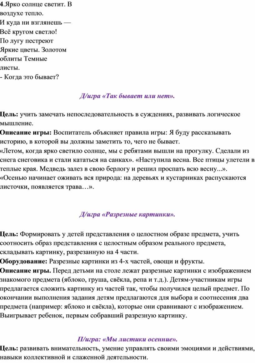 Цель: создать условия для знакомства с характерными особенностями осенних изменений в природе.