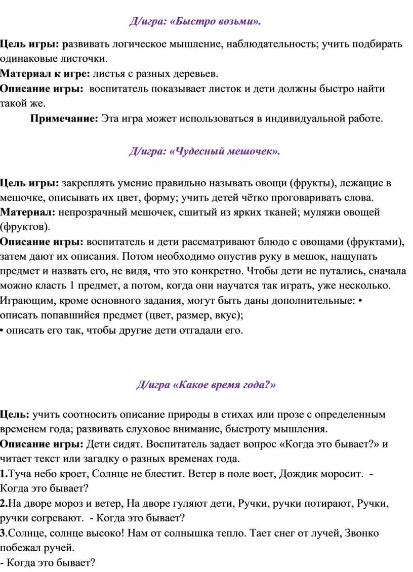 Дидактические игры «Что где растет», «Собираем урожай», «Овощи и фрукты», «Чего не стало», «Узнай по запаху», «Узнай по вкусу», «Чудесный мешочек», «Времена года», «Собери картинку», «С какой ветки детки», «Что где растёт». |