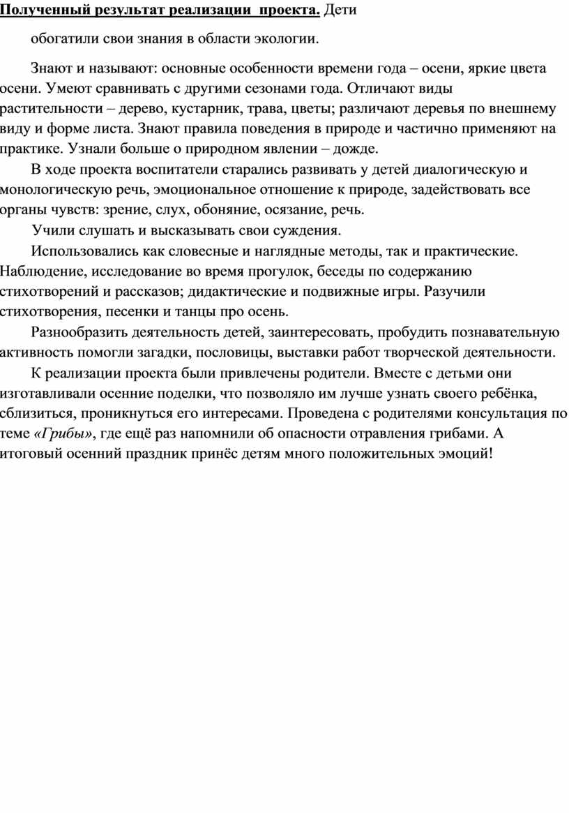 К реализации проекта были привлечены родители. Вместе с детьми они изготавливали осенние поделки, что позволяло им лучше узнать своего ребёнка, сблизиться, проникнуться его интересами. Проведена с родителями консультация по теме «Грибы», где ещё раз напомнили об опасности отравления грибами. А итоговый осенний праздник принёс детям много положительных эмоций!