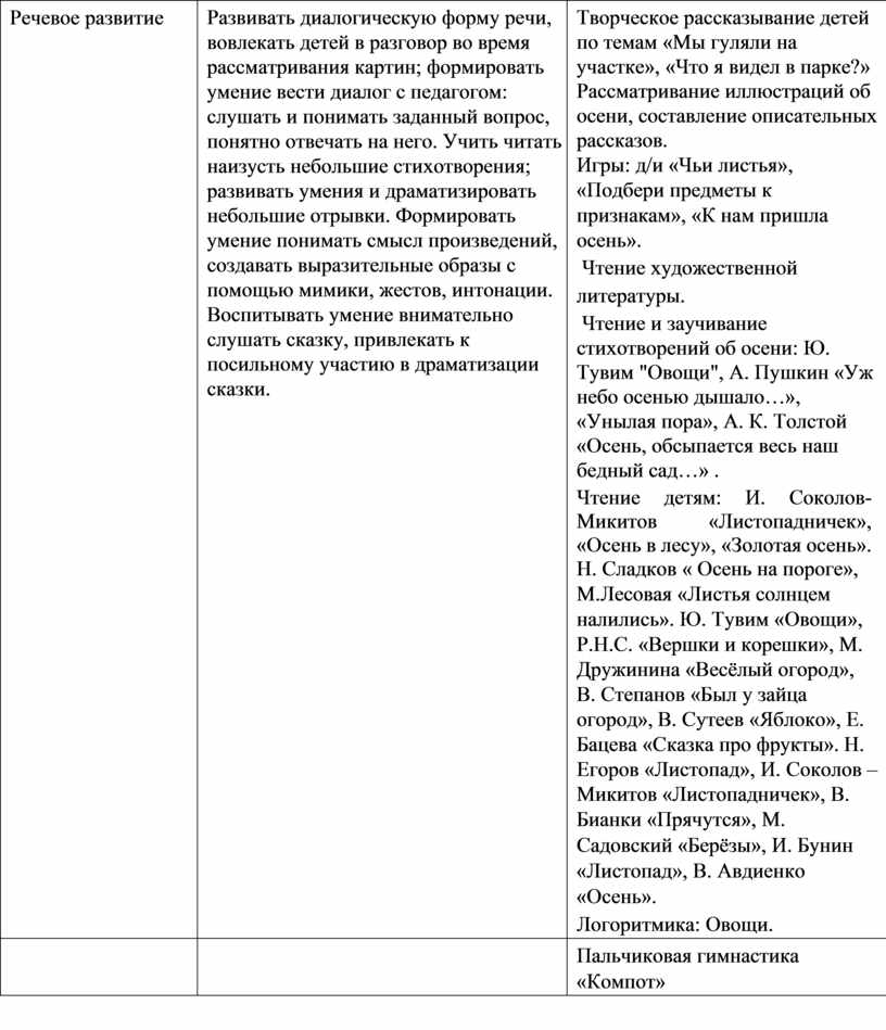 Творческое рассказывание детей по темам «Мы гуляли на участке», «Что я видел в парке?» Рассматривание иллюстраций об осени, составление описательных рассказов. Игры: д/и «Чьи листья», «Подбери предметы к признакам», «К нам пришла осень». Чтение художественной литературы. Чтение и заучивание стихотворений об осени: Ю. Тувим "Овощи", А. Пушкин «Уж небо осенью дышало…», «Унылая пора», А. К. Толстой «Осень, обсыпается весь наш бедный сад…» . Чтение детям: И. Соколов- Микитов «Листопадничек», «Осень в лесу», «Золотая осень». Н. Сладков « Осень на пороге», М.Лесовая «Листья солнцем налились». Ю. Тувим «Овощи», Р.Н.С. «Вершки и корешки», М. Дружинина «Весёлый огород», В. Степанов «Был у зайца огород», В. Сутеев «Яблоко», Е. Бацева «Сказка про фрукты». Н. Егоров «Листопад», И. Соколов – Микитов «Листопадничек», В. Бианки «Прячутся», М. Садовский «Берёзы», И. Бунин «Листопад», В. Авдиенко «Осень». Логоритмика: Овощи. |