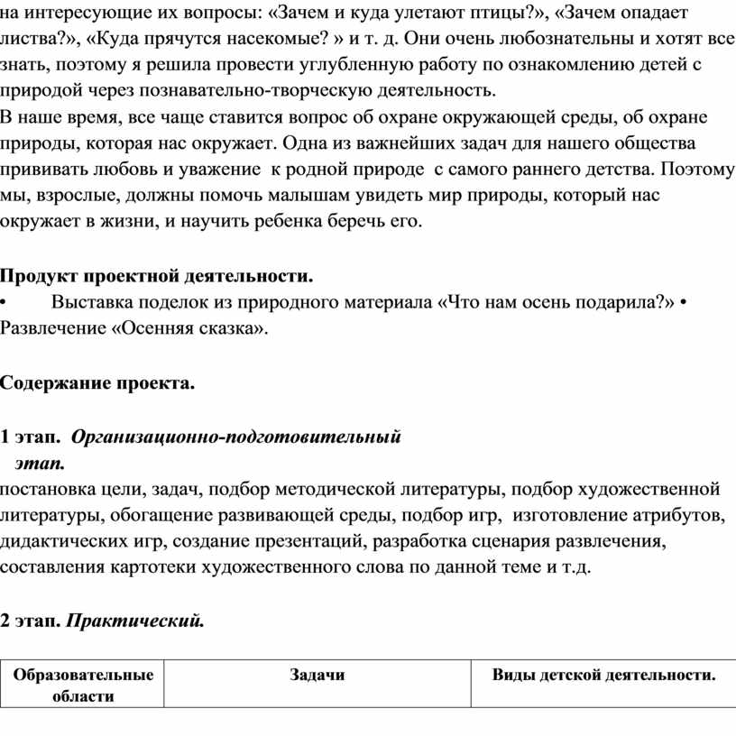 У детей группы маленький жизненный опыт и знания о природе. Они не знакомы с происхождением тех или иных явлений, процессов в природе, не могут ответить на интересующие их вопросы: «Зачем и куда улетают птицы?», «Зачем опадает листва?», «Куда прячутся насекомые? » и т. д. Они очень любознательны и хотят все знать, поэтому я решила провести углубленную работу по ознакомлению детей с природой через познавательно-творческую деятельность.