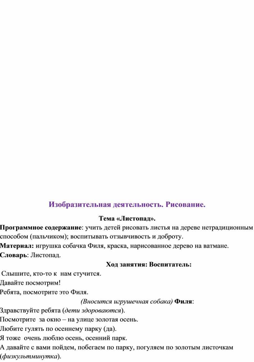 Программное содержание: учить детей рисовать листья на дереве нетрадиционным способом (пальчиком); воспитывать отзывчивость и доброту.