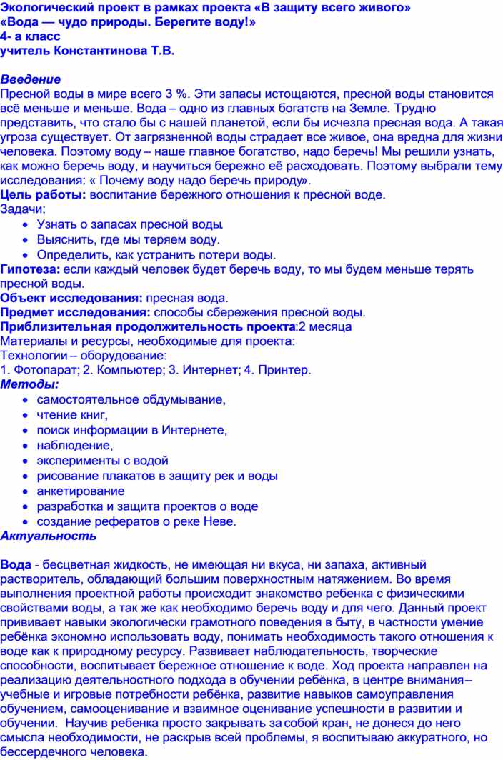 Вода - бесцветная жидкость, не имеющая ни вкуса, ни запаха, активный растворитель, обладающий большим поверхностным натяжением. Во время выполнения проектной работы происходит знакомство ребенка с физическими свойствами воды, а так же как необходимо беречь воду и для чего. Данный проект прививает навыки экологически грамотного поведения в быту, в частности умение ребёнка экономно использовать воду, понимать необходимость такого отношения к воде как к природному ресурсу. Развивает наблюдательность, творческие способности, воспитывает бережное отношение к воде. Ход проекта направлен на реализацию деятельностного подхода в обучении ребёнка, в центре внимания – учебные и игровые потребности ребёнка, развитие навыков самоуправления обучением, самооценивание и взаимное оценивание успешности в развитии и обучении. Научив ребенка просто закрывать за собой кран, не донеся до него смысла необходимости, не раскрыв всей проблемы, я воспитываю аккуратного, но бессердечного человека.