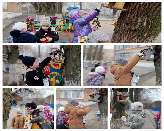 Акция «Столовая для пернатых» развешивание кормушек на территории детского сада.