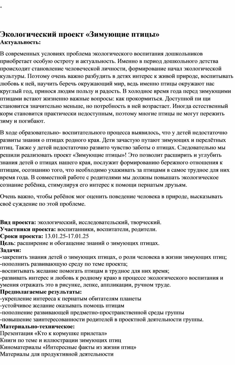 В современных условиях проблема экологического воспитания дошкольников приобретает особую остроту и актуальность. Именно в период дошкольного детства происходит становление человеческой личности, формирование начал экологической культуры. Поэтому очень важно разбудить в детях интерес к живой природе, воспитывать любовь к ней, научить беречь окружающий мир, ведь именно птицы окружают нас круглый год, принося людям пользу и радость. В холодное время года перед зимующими птицами встают жизненно важные вопросы: как прокормиться. Доступной пи щи становится значительно меньше, но потребность в ней возрастает. Иногда естественный корм становится практически недоступным, поэтому многие птицы не могут пережить зиму и погибают.
