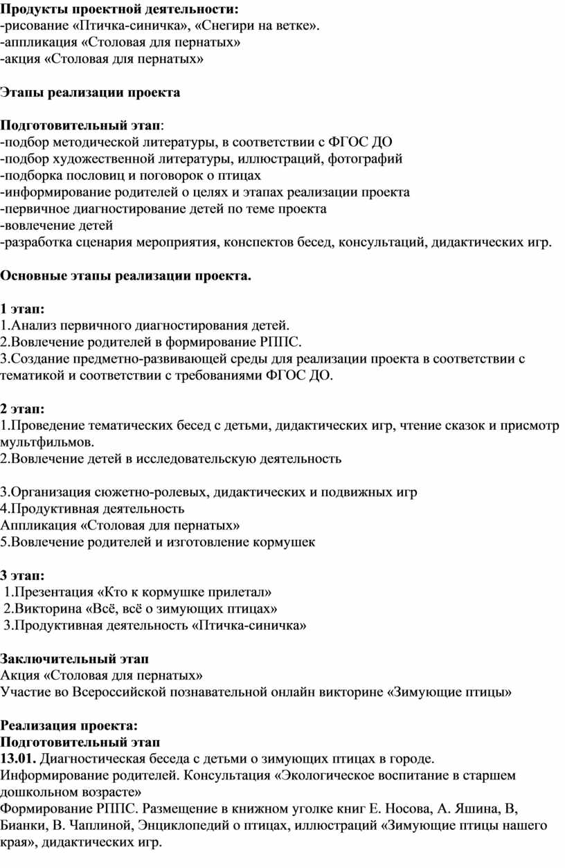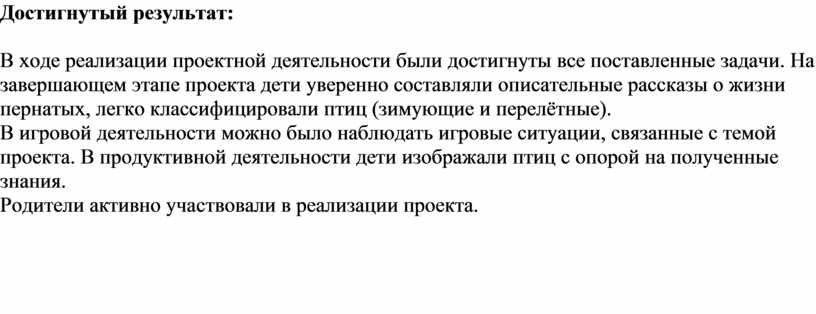 В ходе реализации проектной деятельности были достигнуты все поставленные задачи. На завершающем этапе проекта дети уверенно составляли описательные рассказы о жизни пернатых, легко классифицировали птиц (зимующие и перелётные).