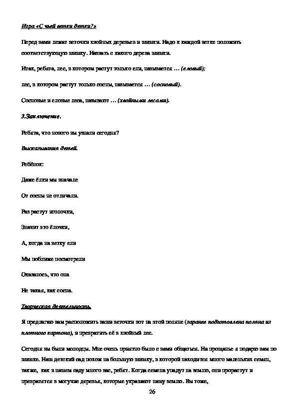 Перед вами лежат веточки хвойных деревьев и шишки. Надо к каждой ветке положить