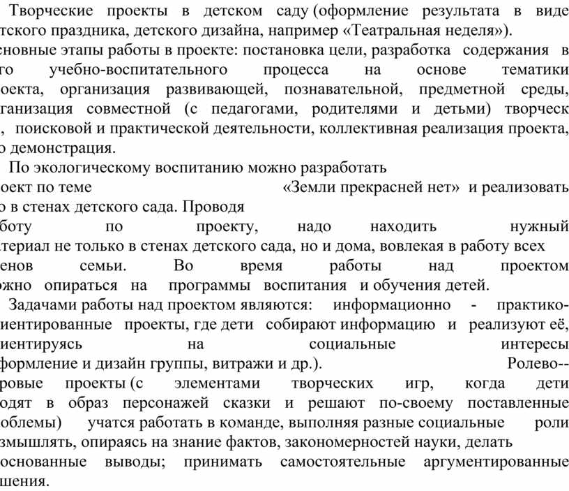 Творческие проекты в детском саду (оформление результата в виде детского праздника, детского дизайна, например «Театральная неделя»). Основные этапы работы в проекте: постановка цели, разработка содержания всего учебно-воспитательного процесса на основе тематики проекта, организация развивающей, познавательной, предметной среды, организация совместной (с педагогами, родителями и детьми) творческой, поисковой и практической деятельности, коллективная реализация проекта, его демонстрация.