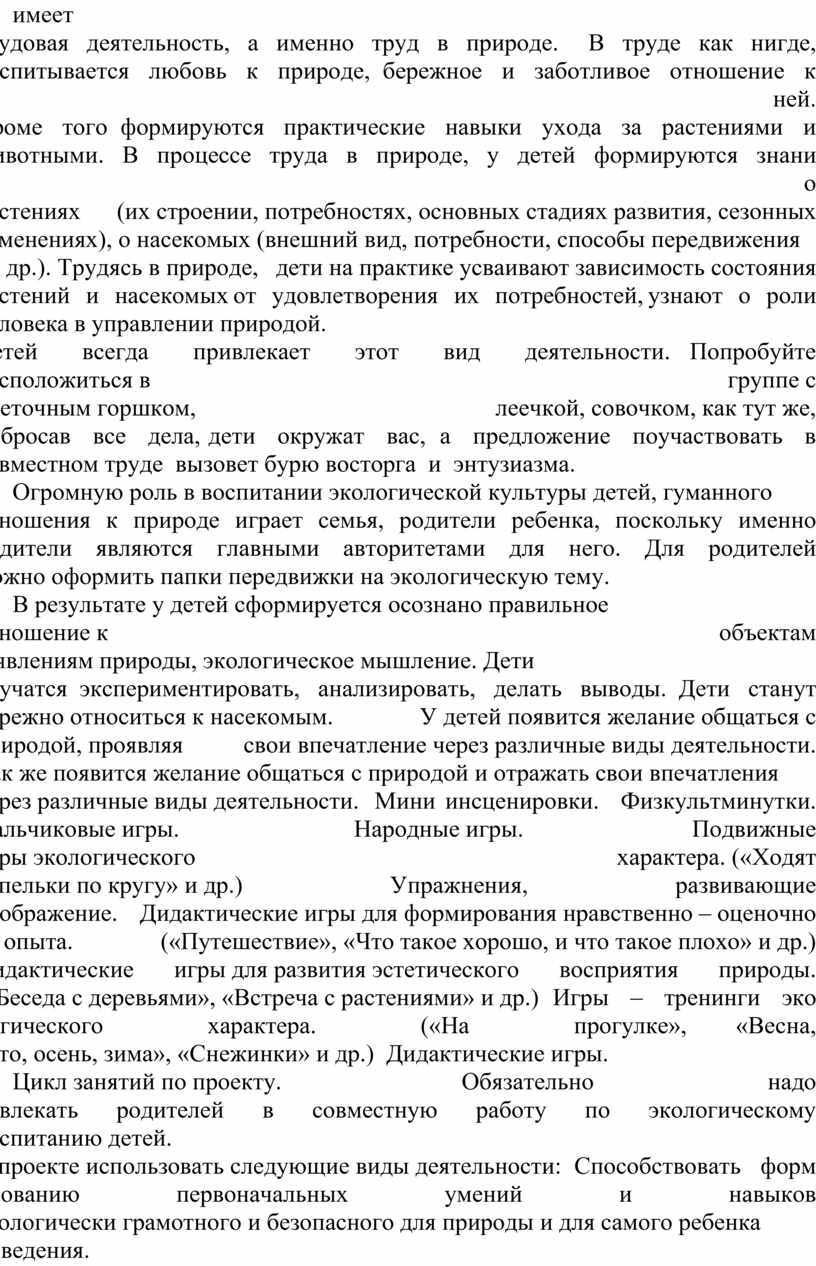 В результате у детей сформируется осознано правильное отношение к объектам и явлениям природы, экологическое мышление. Дети научатся экспериментировать, анализировать, делать выводы. Дети станут бережно относиться к насекомым. У детей появится желание общаться с природой, проявляя свои впечатление через различные виды деятельности. Так же появится желание общаться с природой и отражать свои впечатления через различные виды деятельности. Мини инсценировки. Физкультминутки. Пальчиковые игры. Народные игры. Подвижные игры экологического характера. («Ходят капельки по кругу» и др.) Упражнения, развивающие воображение. Дидактические игры для формирования нравственно – оценочного опыта. («Путешествие», «Что такое хорошо, и что такое плохо» и др.) Дидактические игры для развития эстетического восприятия природы. («Беседа с деревьями», «Встреча с растениями» и др.) Игры – тренинги экологического характера. («На прогулке», «Весна, лето, осень, зима», «Снежинки» и др.) Дидактические игры.