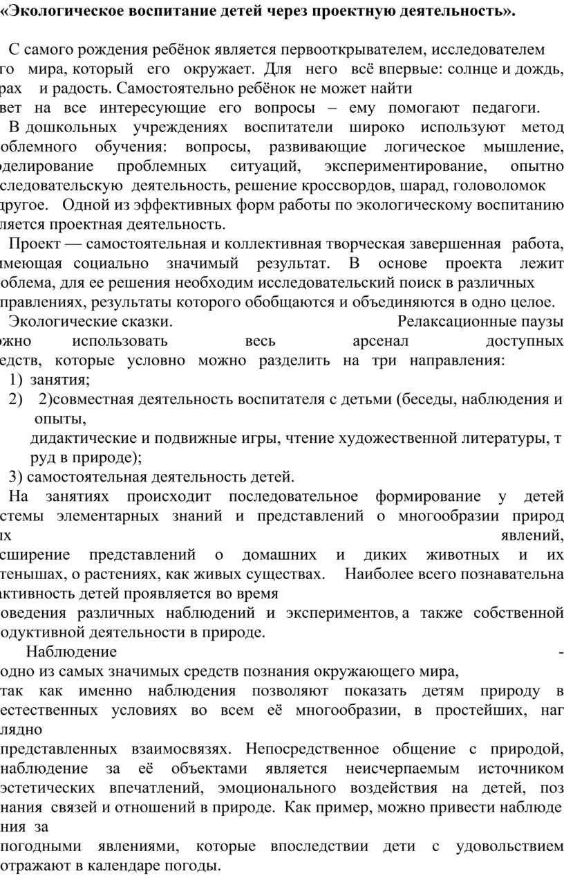 В дошкольных учреждениях воспитатели широко используют метод проблемного обучения: вопросы, развивающие логическое мышление, моделирование проблемных ситуаций, экспериментирование, опытно исследовательскую деятельность, решение кроссвордов, шарад, головоломок и другое. Одной из эффективных форм работы по экологическому воспитанию является проектная деятельность.