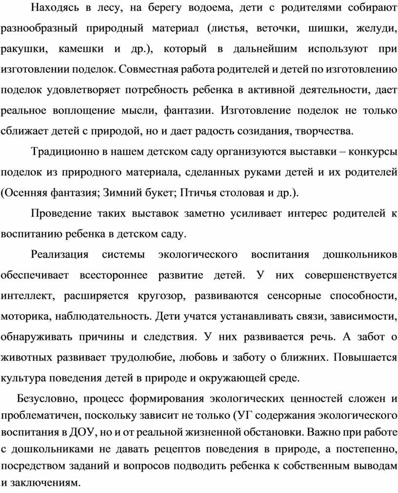 Уровень экологического развития детей во многом определяется степенью экологической грамотности родителей. Немаловажное значение имеет просвещение родителей в области охраны окружающей среды. Находясь в лесу, на берегу водоема, дети с родителями собирают разнообразный природный материал (листья, веточки, шишки, желуди, ракушки, камешки и др.), который в дальнейшим используют при изготовлении поделок. Совместная работа родителей и детей по изготовлению поделок удовлетворяет потребность ребенка в активной деятельности, дает реальное воплощение мысли, фантазии. Изготовление поделок не только сближает детей с природой, но и дает радость созидания, творчества.