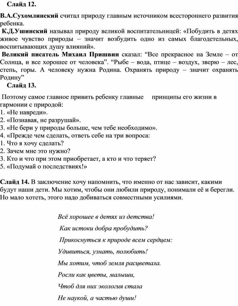 В.А.Сухомлинский считал природу главным источником всестороннего развития ребенка.