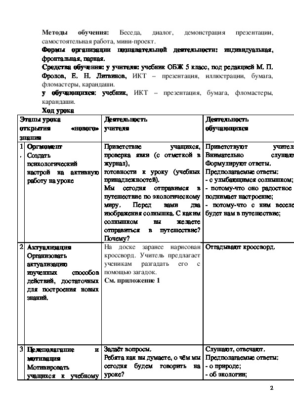 Средства обучения: у учителя: учебник ОБЖ 5 класс, под редакцией М. П.