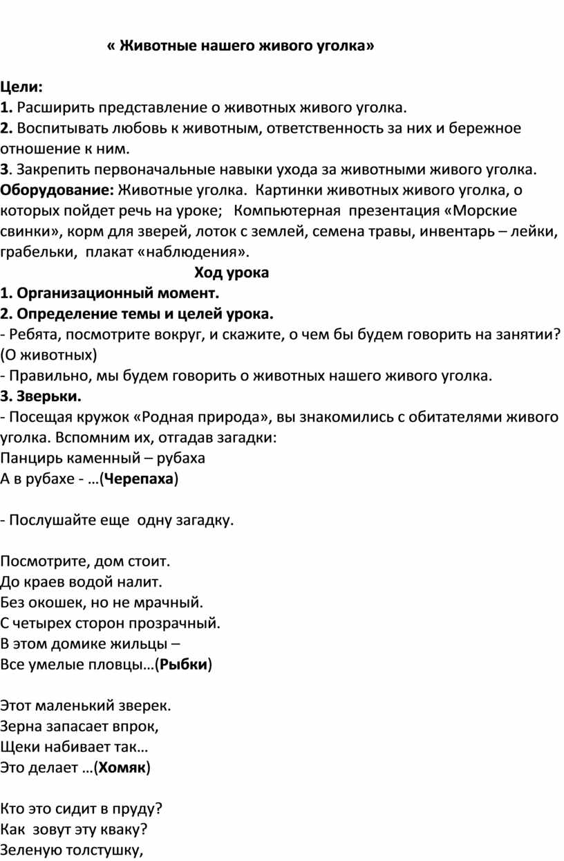 3. Закрепить первоначальные навыки ухода за животными живого уголка.