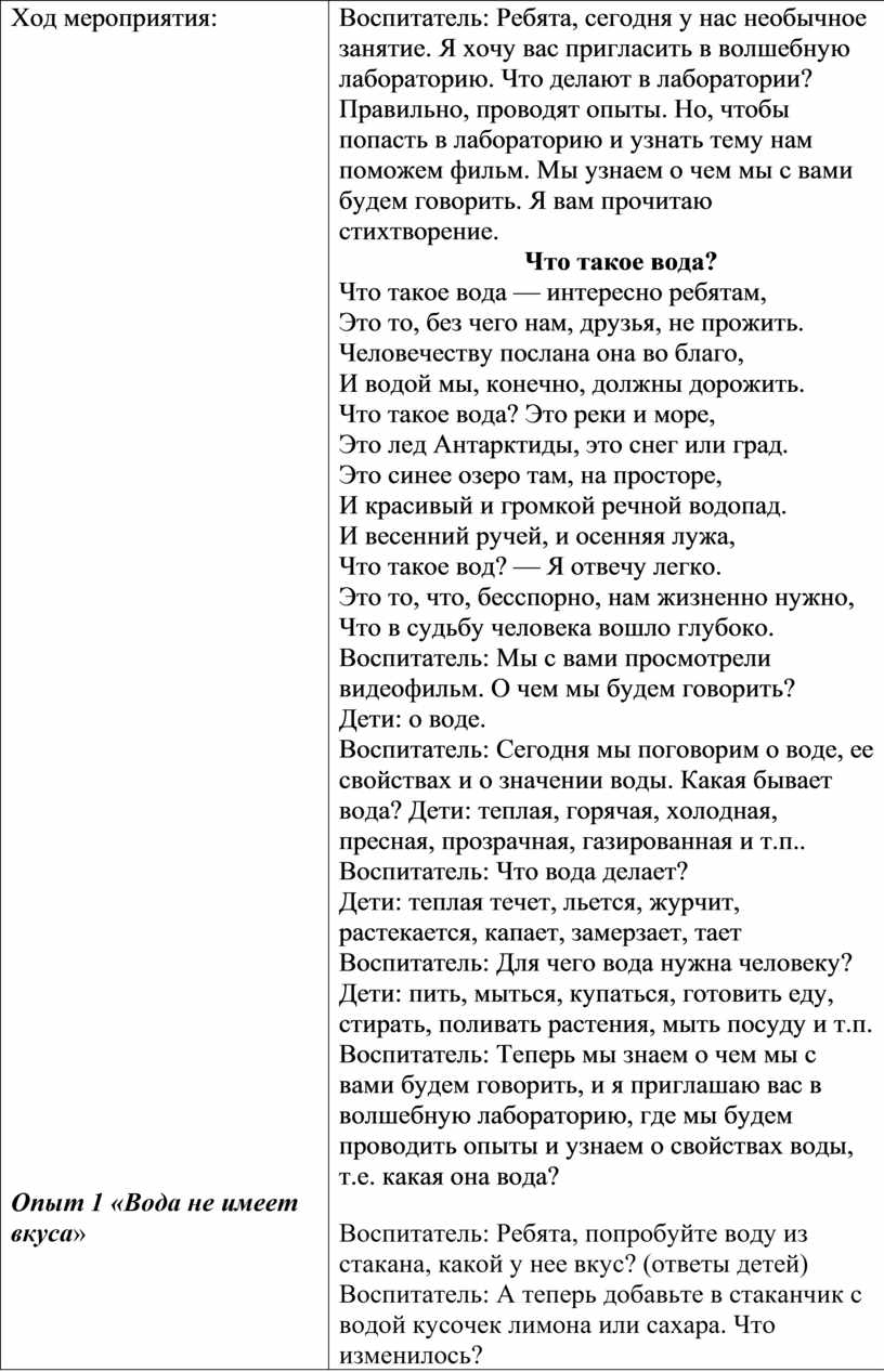Что такое вода — интересно ребятам, Воспитатель: Мы с вами просмотрели видеофильм. О чем мы будем говорить? Дети: о воде. Воспитатель: Сегодня мы поговорим о воде, ее свойствах и о значении воды. Какая бывает вода? Дети: теплая, горячая, холодная, пресная, прозрачная, газированная и т.п.. Воспитатель: Что вода делает? Дети: теплая течет, льется, журчит, растекается, капает, замерзает, тает Воспитатель: Для чего вода нужна человеку? Дети: пить, мыться, купаться, готовить еду, стирать, поливать растения, мыть посуду и т.п. Воспитатель: Теперь мы знаем о чем мы с вами будем говорить, и я приглашаю вас в волшебную лабораторию, где мы будем проводить опыты и узнаем о свойствах воды, т.е. какая она вода? Воспитатель: Ребята, попробуйте воду из стакана, какой у нее вкус? (ответы детей) Воспитатель: А теперь добавьте в стаканчик с водой кусочек лимона или сахара. Что изменилось? Дети: Вода стала сладкая, вода стала кислая. Мы изменили вкус воды. Вывод: вода не имеет вкуса. На фланелераф выставляется схема. Воспитатель: Ребята, понюхайте воду в стаканчике. Как она пахнет? (ответы детей ) Теперь добавьте в воду чеснок, перемешайте ложечкой и опять понюхайте. Что произошло с водой? Дети: вода изменила запах, пахнет чесноком. Вывод: вода не имеет запаха. На фланелеграф выставляется схема. Воспитатель: Ребята, что пройзойдет если в молоко мы поставим ложку и в воду тоже? Что изменилось? . В каком стакане мы видим ложку? (ответы детей). Вывод: вода не имеет цвета, она прозрачная. Вы хорошо поработали и можно отдохнуть.