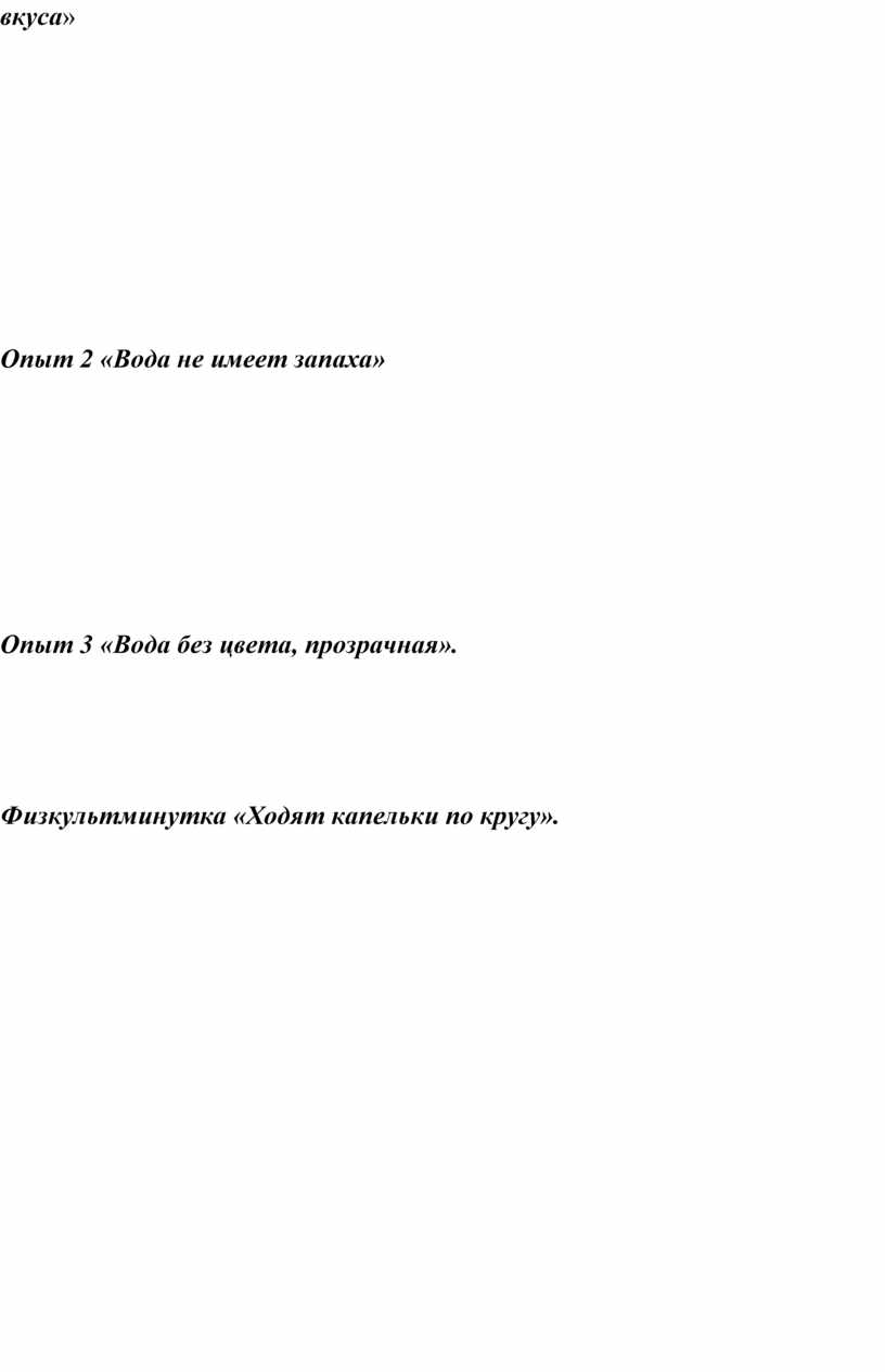 I. Вводная часть – 3мин 1)Вступительное слово воспитателя 2)Просмотр фильма «Вода» 3) Опыт 1 «Вода не имеет вкуса» 4) Опыт 2 «Вода не имеет запаха» 5) Опыт 3 «Вода без цвета, прозрачная». 6) Физкультминутка «Ходят капельки по кругу». 7) Игра-эксперемент «Цветное молоко» III. Заключительная часть – 2 мин 1)Анализ ООД |
