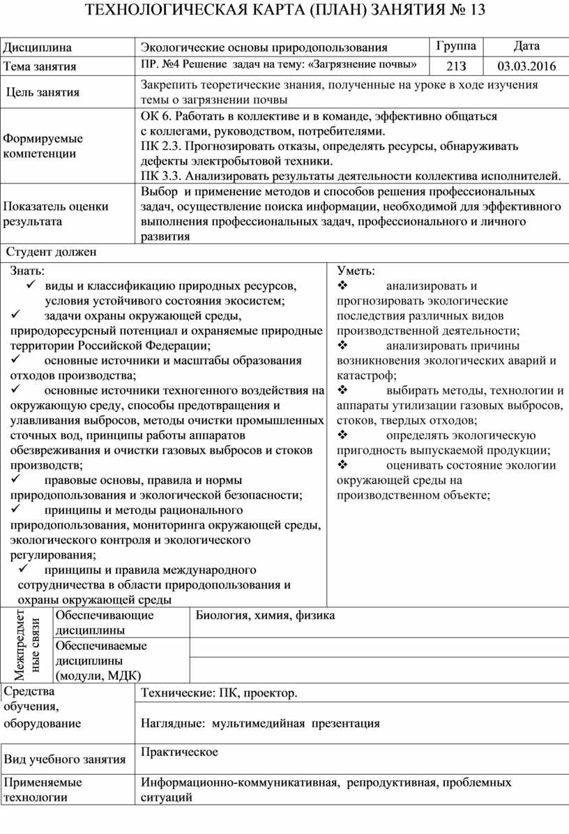 Знать: ü виды и классификацию природных ресурсов, условия устойчивого состояния экосистем; ü задачи охраны окружающей среды, природоресурсный потенциал и охраняемые природные территории Российской Федерации; ü основные источники и масштабы образования отходов производства; ü основные источники техногенного воздействия на окружающую среду, способы предотвращения и улавливания выбросов, методы очистки промышленных сточных вод, принципы работы аппаратов обезвреживания и очистки газовых выбросов и стоков производств; ü правовые основы, правила и нормы природопользования и экологической безопасности; ü принципы и методы рационального природопользования, мониторинга окружающей среды, экологического контроля и экологического регулирования; ü принципы и правила международного сотрудничества в области природопользования и охраны окружающей среды |