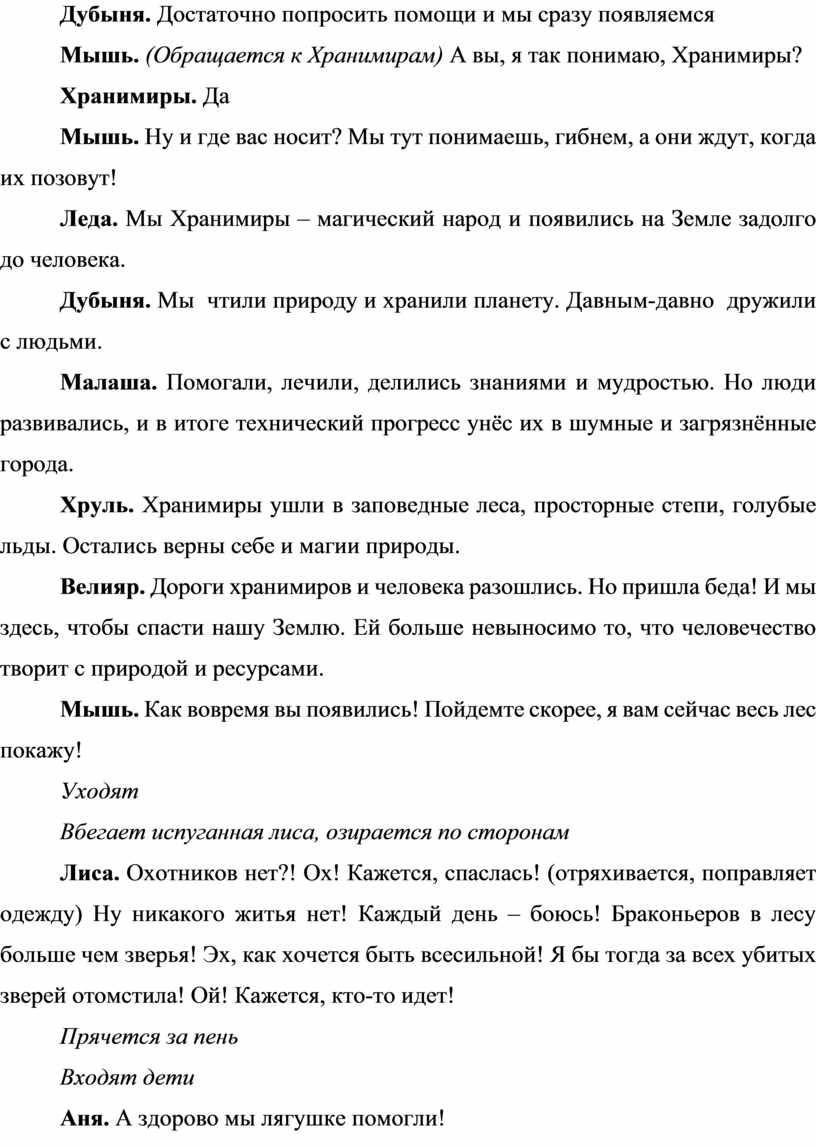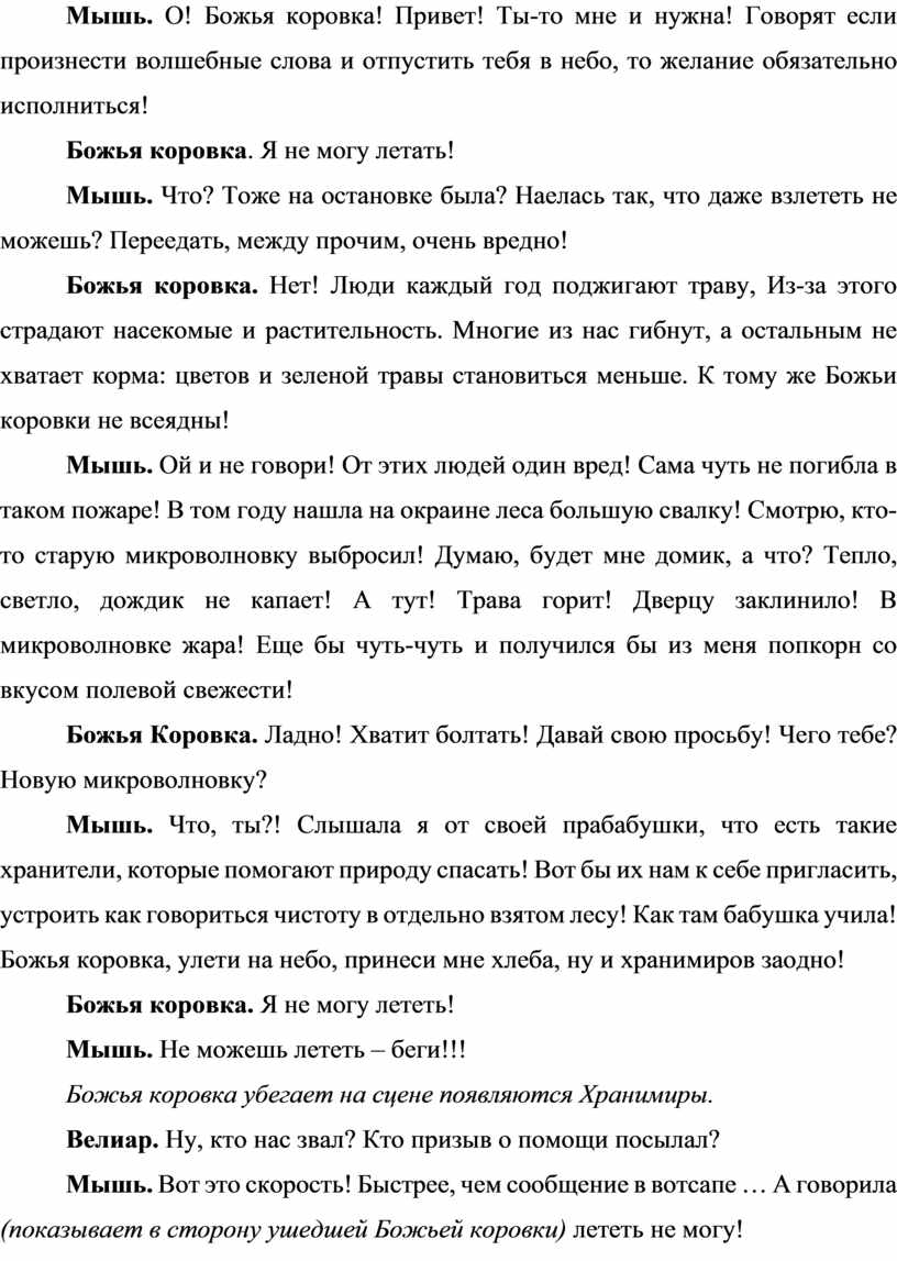 Мышь. Что, ты?! Слышала я от своей прабабушки, что есть такие хранители, которые помогают природу спасать! Вот бы их нам к себе пригласить, устроить как говориться чистоту в отдельно взятом лесу! Как там бабушка учила! Божья коровка, улети на небо, принеси мне хлеба, ну и хранимиров заодно!