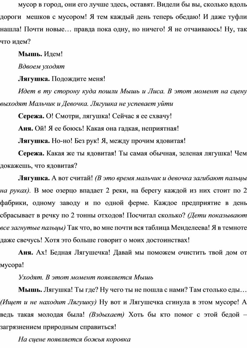 Лягушка. А вот считай! (В это время мальчик и девочка загибают пальцы на руках). В мое озерцо впадает 2 реки, на берегу каждой из них стоит по 2 фабрики, одному заводу и по одной ферме. Каждое предприятие в день сбрасывает в речку по 2 тонны отходов! Посчитал сколько? (Дети показывают все загнутые пальцы) Так что, во мне почти вся таблица Менделеева! Я в темноте даже свечусь! Хотя это больше говорит о моих достоинствах!