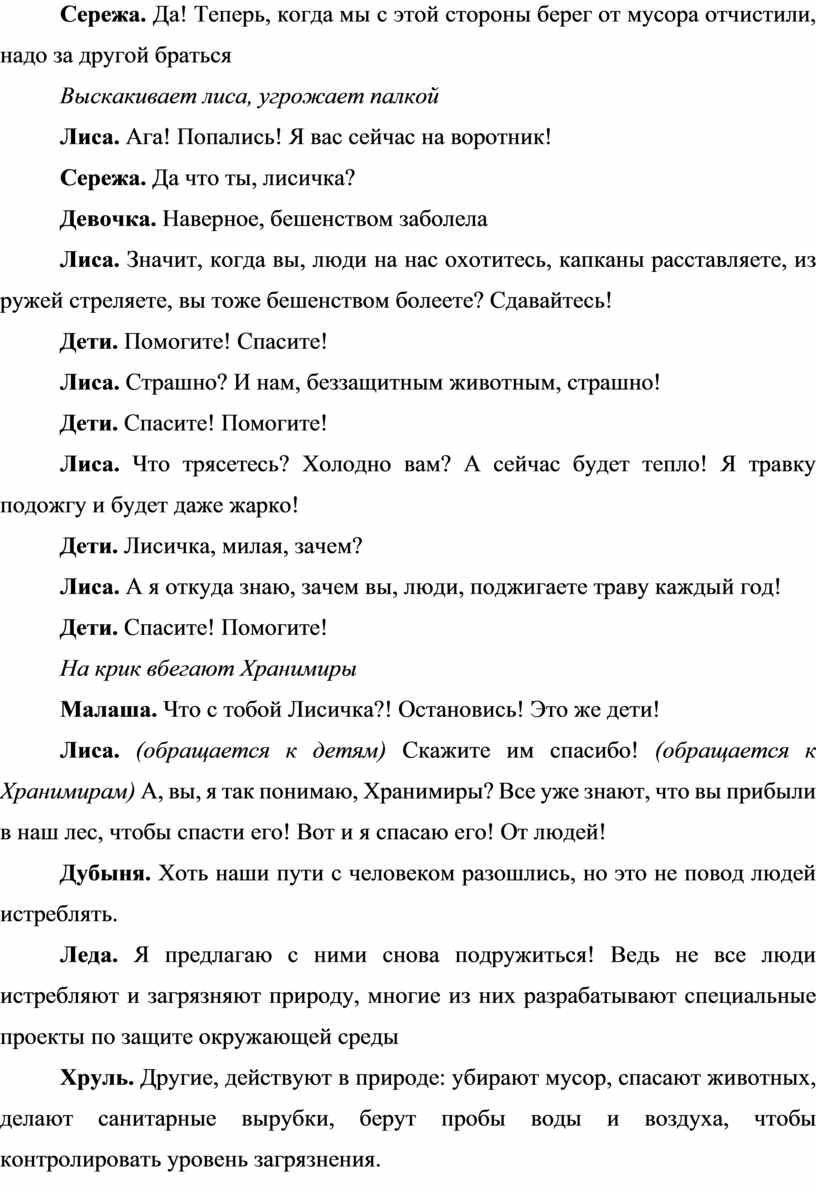 Лиса. (обращается к детям) Скажите им спасибо! (обращается к Хранимирам) А, вы, я так понимаю, Хранимиры? Все уже знают, что вы прибыли в наш лес, чтобы спасти его! Вот и я спасаю его! От людей!