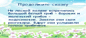 Ведущая: Не редко на таких местах растут грибы. Кто ходил за грибами? Как нужно срывать грибы, чтобы не нанести вред? Давайте послушаем, о чём они говорят грибы: