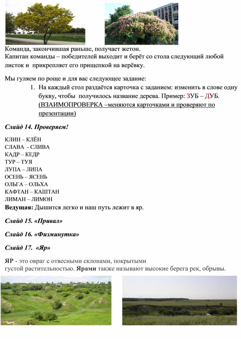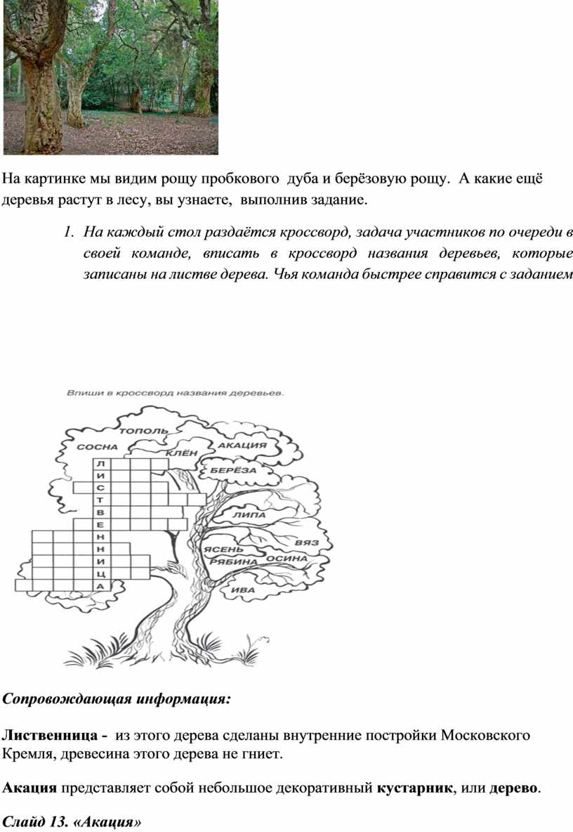 1. На каждый стол раздаётся кроссворд, задача участников по очереди в своей команде, вписать в кроссворд названия деревьев, которые записаны на листве дерева. Чья команда быстрее справится с заданием