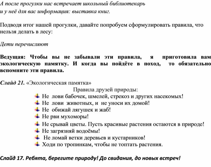 Ведущая: Чтобы вы не забывали эти правила, я приготовила вам экологическую памятку. И когда вы пойдёте в поход, то обязательно вспомните эти правила.