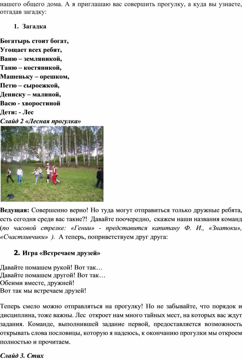 Теперь смело можно отправляться на прогулку! Но не забывайте, что порядок и дисциплина, тоже важны. Лес откроет нам много тайных мест, на которых вас ждут задания. Команде, выполнившей задание первой, предоставляется возможность открывать слова пословицы, которую я надеюсь, к окончанию прогулки мы откроем полностью и прочитаем.